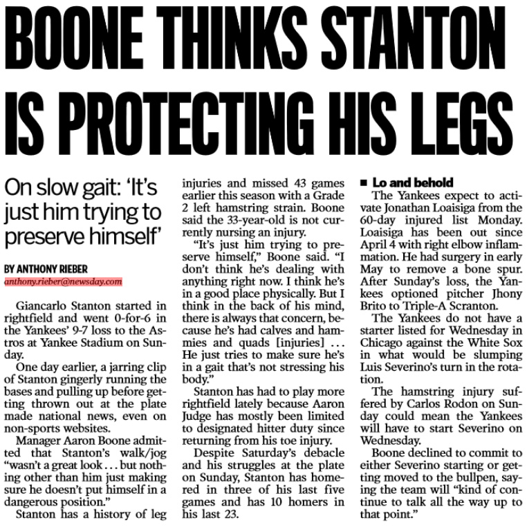 And I feel like taking a poke at people who say it's only because of Judge's injury. Bull. Here's some tough love that I would administer (or, would have already administered) if I were the GM of this OOTPB team: Pull the plug on Donaldson already. Eat the contract. Your sleeve patch ads will pay for that. Pull the plug on Stanton already. Eat his contract, too. What I pay for the YES Network (while not being able to see all the games), multiplied by millions, will pay for that. Note: I don't care at all about his 12 home runs, most of which have come recently after his latest long nap. He is past his prime, batting .198, and is a walking, ticking IL case. Also pull the plug on Volpe. You made a mistake in prematurely anointing him as the next Yankee great, including giving him #11 which will now be an embarrassment when he gets sent back to AAA where he belongs for now. IKF is a utility INfielder. Infield! Make a gift basket of Cordero, Allen, Bauers, Calhoun, and McKinney (mix and match) and get a LF who can hit and play the field. And/or give a shot to Estevan Florial, and I mean a good shot like the rest of this season and into the next. If he's still shaky after that, then that's it for him. As far as the pitchers, well, as a group they are not the problem. Still, I would clean out the rubbish in the bullpen — IKF and Donaldson have better ERAs than some of the fringe guys — and get this: Right about now — and I know this makes me a bad GM — I would have a bad case of buyer's remorse about Carlos Rodon. I would be floating one of those trade deals where I am offering to retain 75% or more of his salary, asking for a decent prospect in return. Just to be rid of him. Yes, I know that I should have more patience, just like I said about Florial. But Florial is a low-risk, low-emotion proposition. To have put all these expensive eggs in Rodon's basket and to have him a) get injured, and get injured again, before he ever threw one Yankee pitch, and b) perform this badly after waiting half the season for him; well, the buyer's remorse would be very intense and I would seek immediate relief.