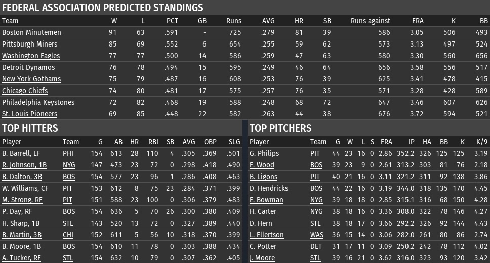 RHP Ben Curtin RHP Angel Lopez LHP Dick Lyons RHP Ken Matson RHP Harry Parker RHP Rusty Petrick RHP Billy Riley RHP Merritt Thomas LHP Art White C Harry Mead C Mike Taylor 1B Dick Walker 2B Tip Harrison 2B Jimmie James 3B Steve Jones 3B Ken Mayhugh SS Ollie Page SS Skipper Schneider LF Huck Hanes LF Rich Langton CF Don Lee CF Orlin Yates RF Chick Browning RF Cliff Moss BNN thinks we'll finish second in the CA, allowing the same amount of runs (520) as the Cannons, but while scoring over 100 fewer. They think we'll finish 92-62, very strong, but still 11 games behind a dominant Cannons squad. All three of our arms rank in the top 10, expecting excellent seasons from Billy Riley (22-12, 3.12, 138), Harry Parker (21-15, 2.90, 150), and Art White (20-14, 3.25, 51). Just two bats, both in the bottom five, with veterans Cliff Moss (.286, 21, 91) and Dick Walker (.255, 13, 57, 40) featured in their top 10. We have plenty of players in the OSA top 20 lists, with Billy Hunter (3rd), Hank Barnett (5th), Clark Car (12th), Skipper Schneider (13th), Harry Mead (18th), Pete Papenfus (1st), Donnie Jones (2nd), and Joe Brown (8th). The only two on the Opening Day roster happened to be the lowest ranked, Skipper and Mead, but I'm sure during the season we'll get new entrants and a drop out or two. Our farm is much improved, and with a bunch of high draft picks we may push even higher. Surprisingly, we've jumped from 9th last Opening Day all the way up to 3rd, with Duke Bybee leading the way at #4. We now have 6 prospects in the top 50, with Bybee leading George Oddo (23rd), George Sutterfield (34th), Eddie Howard (40th), Bert Rogers (42nd), and Otto Christian (48th). Don Lee (63rd) is our only other top 100 prospect, with 20 in the top 250 and 42 in the top 500. With all these talented young arms, we can add stars at the deadline if needed, but unless a truly game changing player is available, we'll likely continue to stand to pat until what should be a crazy fun offseason. We start our season at home, hosting the New York Stars for three. The Stars are expected to be much better this season, as they had a great second half and get a full season of Eli Panneton (9-9, 2, 3.11, 64). Dixie Lee, the first player to enlist, has returned stateside, giving them a solid #2 and they picked up Ed Cornett (1-1, 5.22, 23) from the Pioneers in the offseason to add rotation depth. While neither of these guys are starts, they are still above average compared to the rest of the active pitchers, and run prevention could be something they thrive at. The lineup has its holes, but Jim Honeywood (.366, 35) had a breakout season at 32 and they'll get another year of experience for Chubby Hall (.257, 15, 86) and Elijah Boudreau (.271, 7, 50, 6). We tend to play better at home, so I expect a series win to kick things off, but don't expect the Stars to roll over. Quickly on the road after as we'll head to Montreal for three with the Saints to finish the week. Montreal is coming off another tough season, but they should see better production from young hurlers Pat Weakly (11-15, 4.32, 122) and Jackie James (8-9, 4.11, 52). The rest of the rotation has its question marks, but I doubt Jake DeYoung (5-14, 4.88, 77) will have another sub 75 ERA+ season with a K/BB above 2.5. Former 1st Rounder Hank Eason (.264, 3, 11) cracked his first Opening Day roster after a nice 19 game debut last season, joining some talented bats in Jake Hughes (.287, 50, 26), who finally shifted to third, and Bill Greene (.264, 8, 57, 24). Hughes is at third now because talented shortstop Gordie Perkins won the starting job, as the former 3rd Overall Pick and current #14 prospect will make his big league debut at 22. We definitely could have had a tougher start to the season, and I think we'll manage to pick up a pair of series wins to get things going. Last edited by ayaghmour2; 01-02-2023 at 03:32 PM. |