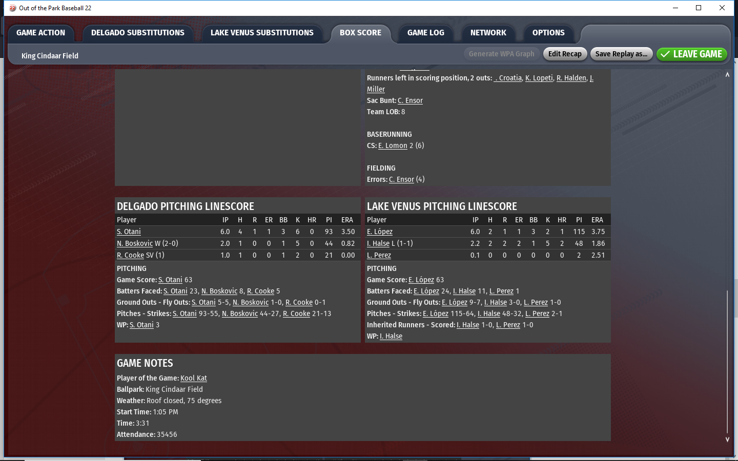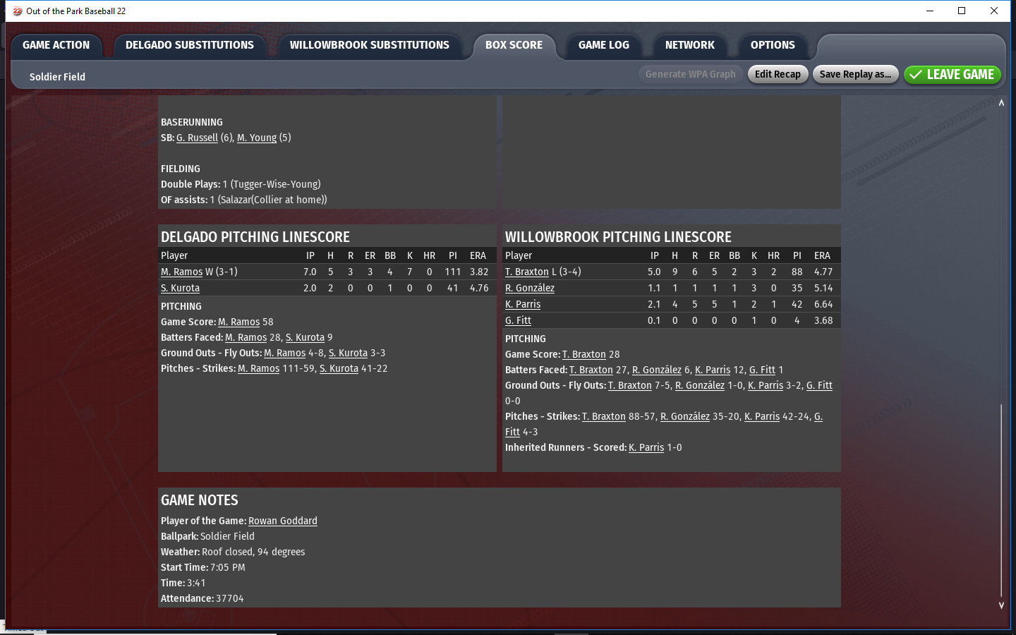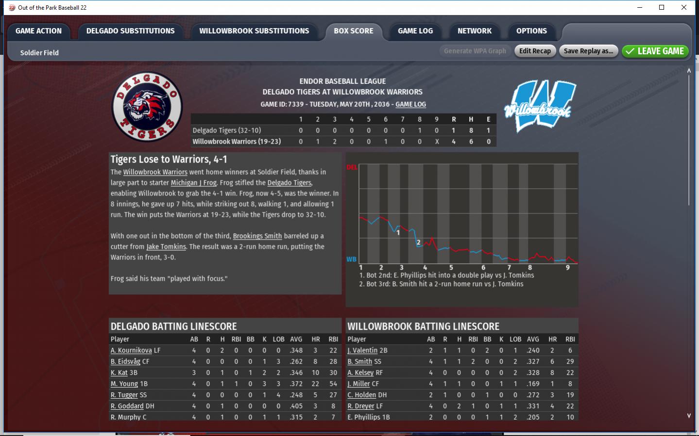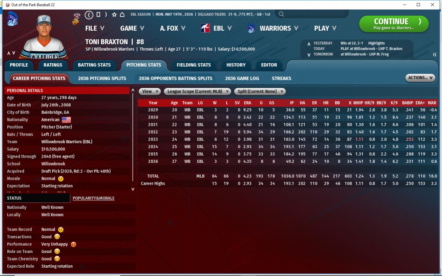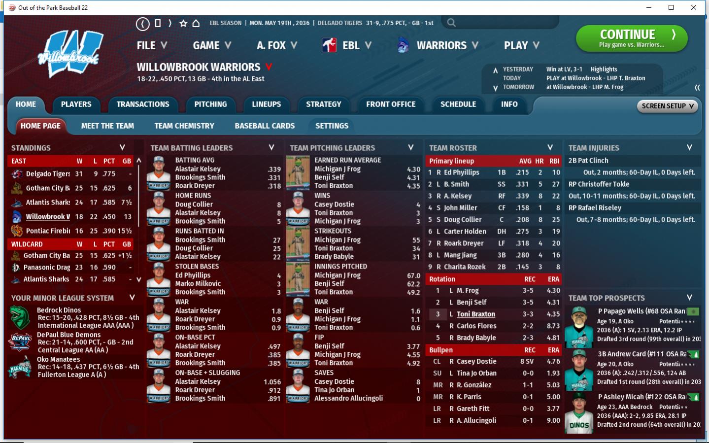 18-22 13 GB AL East We are 3-0 vs the Warriors this season. Now that the Warriors have Cf John Miller back they have begun playing much better and are 9-7 in May. While i do not fear Willowbrook catching us for some time, them sweeping us is always at the back of my mind. We typically are terrible against Braxton, self & Frog and most of my team struggles vs LHP this season. They also acquired veteran If Jesus Valentin, who gives them depth at SS & 2b.