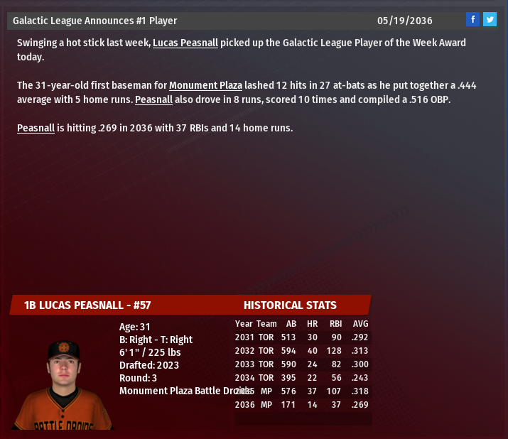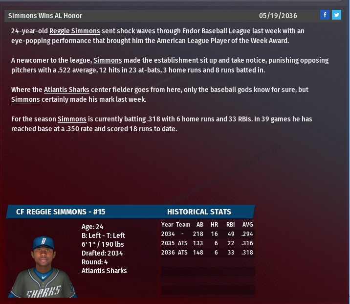Atlantis Cf Reggie Simmons has a 5 Hit game. Kansas City Rf Juan Gonzalez is named MLB AL POTW. San Diego Rf Troy Swanson is named NL POTW. Tokyo 2b Joe Morgan is named UBL EL POTW.