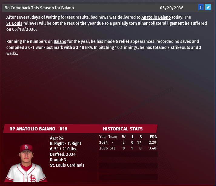Cleveland loses RP Uberto Bendinelli for the season. Solo Millennium Falcons claim CF Tamasaburo Sasaki off of Waivers from Bird City.
