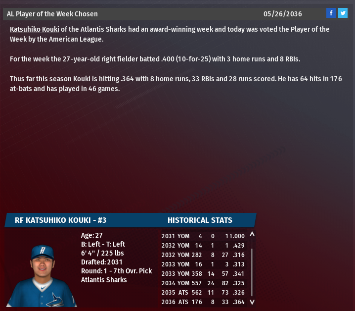 25-22 4½ game lead AL Central. The Red Devils are a Cinderella team this year but the question remains when the pumpkins will emerge. Joe Caine is a veteran that anchors teh staff but most of the offense are relatively unknowns. Offense - C - They have some power but they are a low AVG team with a low OBP. Medina is solid as is Trueman. Veteran 1b R.P. McMurphy is 3 HR shy of 600 but his best days are far behind him. They are weak at C and Cf. Pitching - C - With Caine, they are better, without him they are struggling. Krause & Rankovic are good overall, after that there is a drop off. The back end of the pen is good. Getting to them is an issue. Defense - B- - While the stats say they are not good on defense, it's hard to advance a base on any of their OF. Braim is not great throwing out runners but most of the rotation is good at holding runners. The IF defense is above average. 2036 Additions SP Joe Caine (INJ) - Although Caine is injured i have to mention him as he is a legit ace and i heavily pursued him. 1b R.P. McMurphy - 3 HR shy of 600. He still can hit a HR but will be lucky to hit .220. He is a great leader. SP Paul Ashe - Paul has been a bad SP the last 3 years after doing really well his 1st 4 seasons. RP Andres Duran - Duran is a rookie and he was a SP in the minors but typically had more BB then K. RP Anastasio Salazar - Salazar is an average MR. He has some good seasons, some bad. RP Warner Waters - Warner (no relation to Tim & Chris) is a very good MR with odd stats. He has a good career ERS but only K's about 10 more then he BB in a typical season.