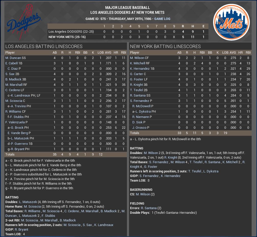 Close game, but one that the Mets will take as they edge the Dodgers 5-4 and complete the sweep @ Shea Stadium. El Sid, once again showed his stuff as he got his 6th win of the year. Ray Knight was 3 for 4, and Kevin Mitchell had 4 of the Mets' 5 RBI. The Dodgers did threaten late, but the bullpen, although a little shaky, did close out the game with Jesse Orosco getting his 7th save. The Mets have now won 5 in a row. Next up: A 3-game series against the San Francisco Giants @ Shea. RP: 25-16 RL: 30-11 (Win vs LA 5-2)