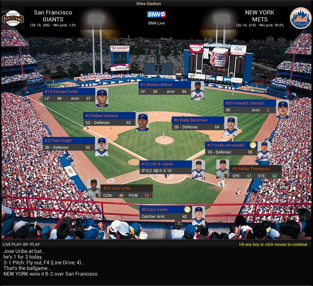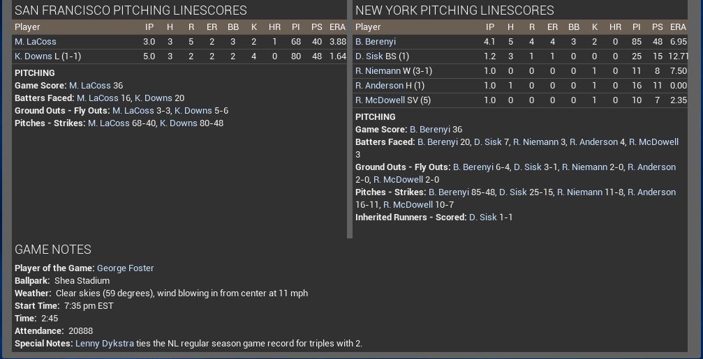 Every time Bruce Berenyi is the starter, i get nervous. He actually did pretty good and he got a lot of help when the Mets got out to a 5-run lead. But the 1986 SF Giants were a good team and they came storming right back on my bullpen, and tied it up. But George Foster, who was 2 for 4 with 3 RBI in this game was the difference maker as the Mets got the win over the Giants 7-5 @ Shea. The Mets are 10 games over .500 and are on a 6 game winning streak! RP: 26-16 RL: 31-11 (Win vs SF 8-7)