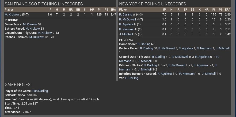 I said to "The Kid", Can you get me a nice solid hit up there?" Gary Carter looked at me, then turned and walked up to the plate. CRACK!! PH HR to put the Mets in front for good! He came back to the dugout and sat right next to me and said "How's that?" I didnt even look at him and stared out into Shea and said, nonchalantly, "Ehhhh...Not bad." His HR was the difference as the Mets finish the sweep against the SF Giants 2-1 @ Shea. Ron Darling got his 4th win, and the bullpen finished the job with John Mitchell getting the save this time. The Mets have now won 8 in a row! Next up: A 3-game series against the San Diego Padres @ Shea Stadium. RP: 28-16 RL: 31-13 (Loss vs SF 3-7)