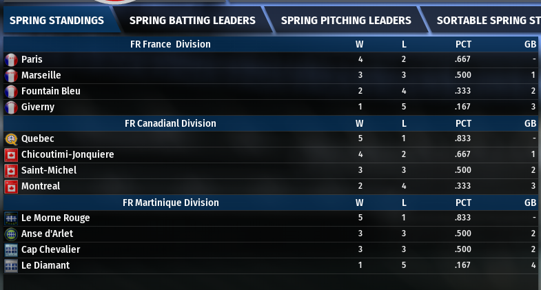 First, I wasn't traded. Second, the team had a very quiet off-season. Team management is sticking to the plan of bringing along the younger players. Third, both Herve and I have been invited to spring training. After week 1 Le Diamant is 1-5. Herve is batting .333 and I'm one for 8 with a double (.125).