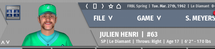 I retired the first 6 batters in a row so I was off to a good start. Most of the Fountain Bleu line-up are considerably more senior than I so I was happy with my results. I almost escaped with just 2 runs scored on me but our reliever in the 6th gave up a few hits that scored base runners that I was responsible for as I gave up a single and my only walk of the day. Coach Donovan Riviere complimented me on my 50/74 strike to pitch ratio (I didn't even know they tracked that type of data). Here is the box score. I'll have more information to share after I pack up and catch the team bus to Basse-Pointe. Thanks, everyone, for joining me in Spring Training 1962.