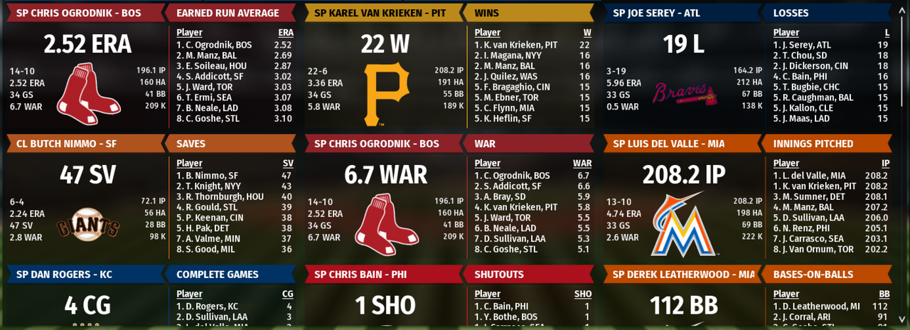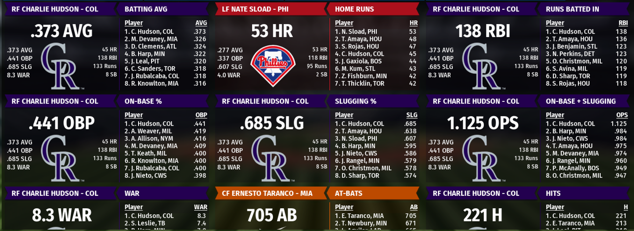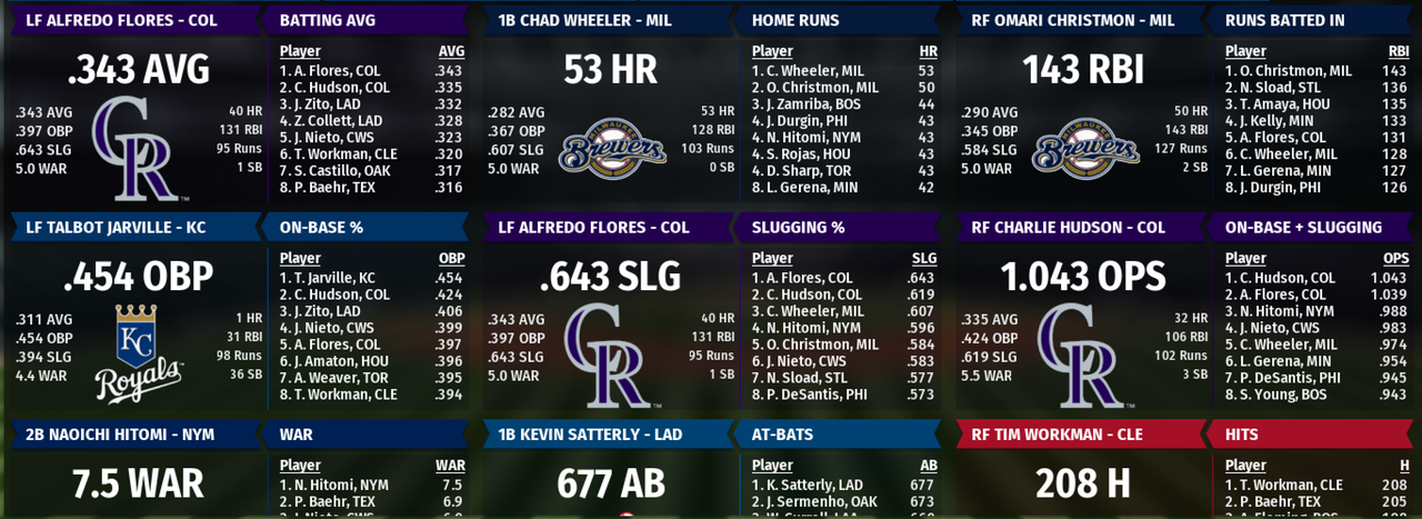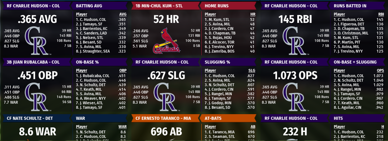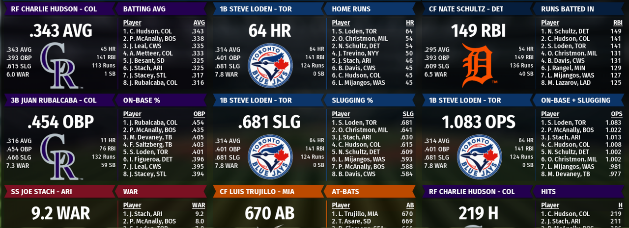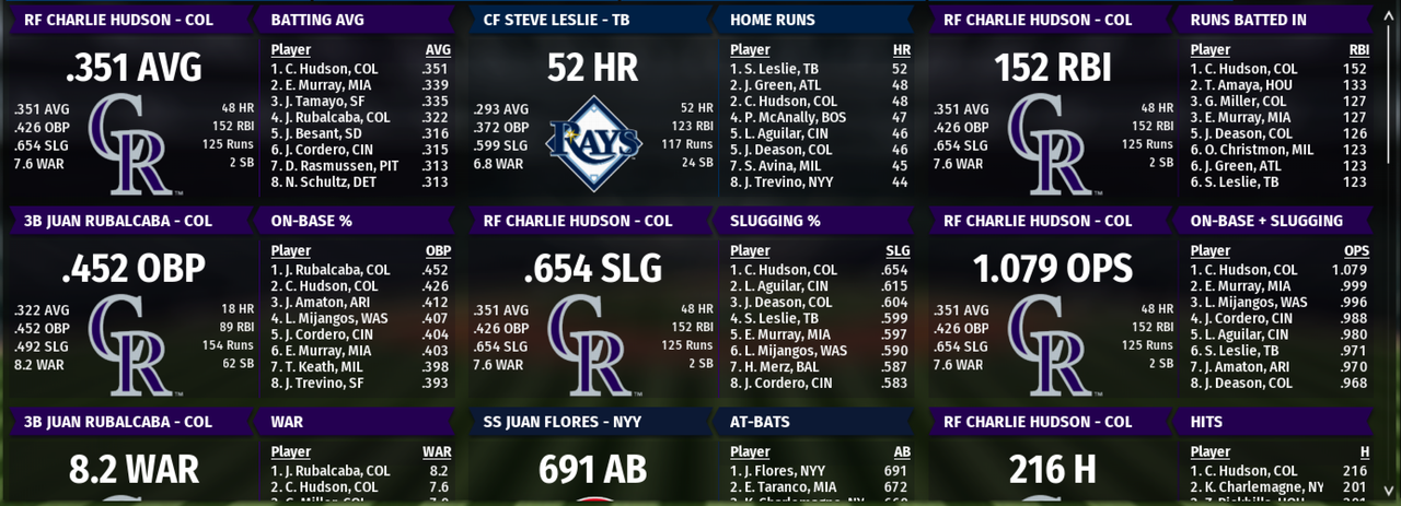 Cy Young: AL- Juan Romero (OAK) NL- Ogrodnik ROY: AL- Steve Leslie (TB) NL- Hitomi HOF: Andy Hood Now for our 60th season. First, the standings... Regular season standings... ![]() Batting leaders... ![]() Pitching leaders... ![]() And playoffs... ![]() So the Giants win back-to-back. |