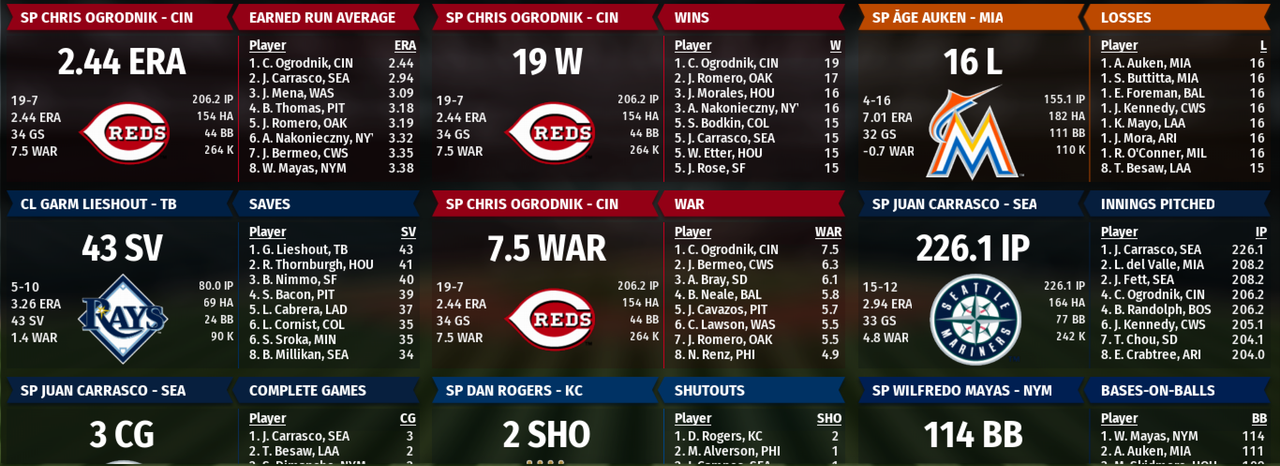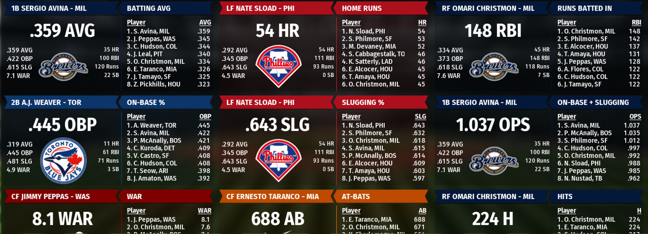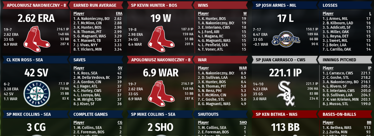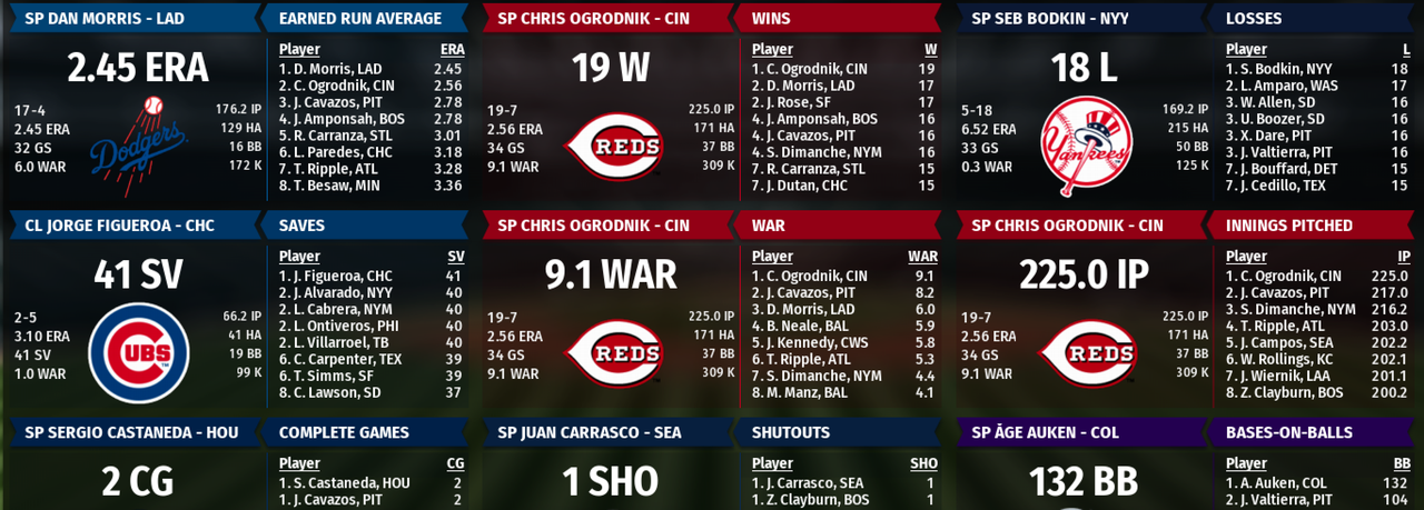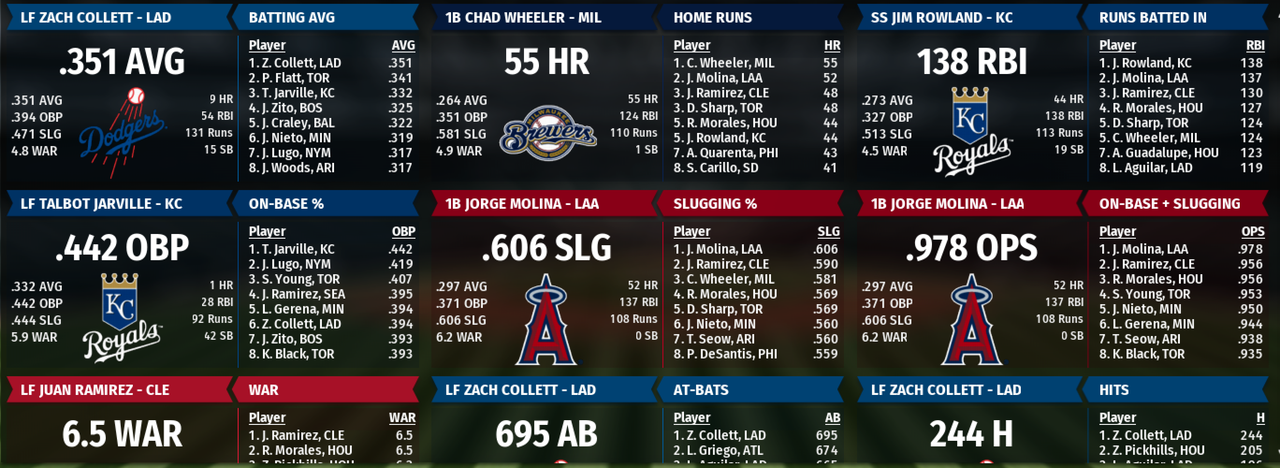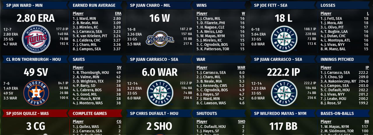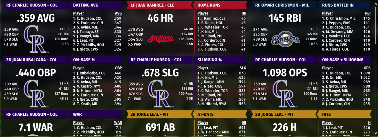 Cy Young: AL- Juan Romero (OAK) NL- Ogrodnik ROY: AL- Steve Leslie (TB) NL- Hitomi HOF: Andy Hood Now for our 60th season. First, the standings... Regular season standings... ![]() Batting leaders... ![]() Pitching leaders... ![]() And playoffs... ![]() So the Giants win back-to-back. |