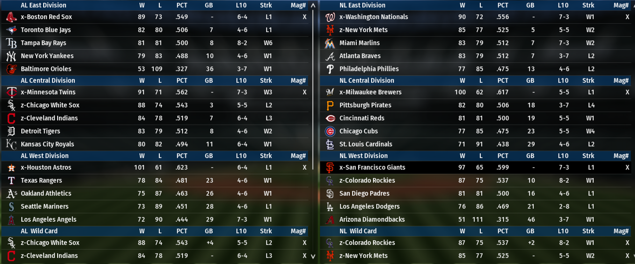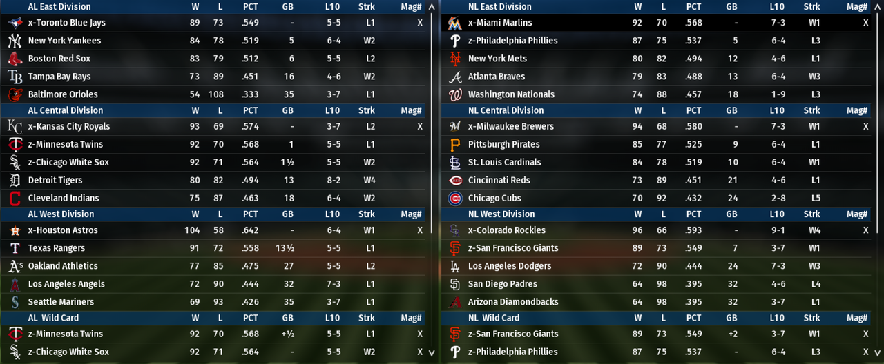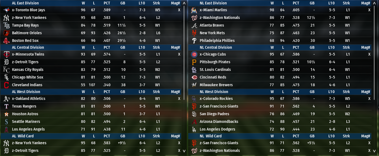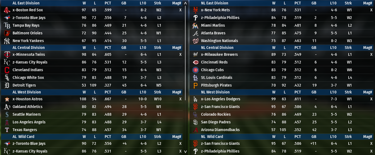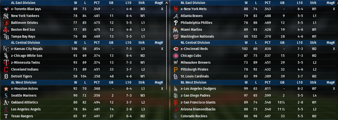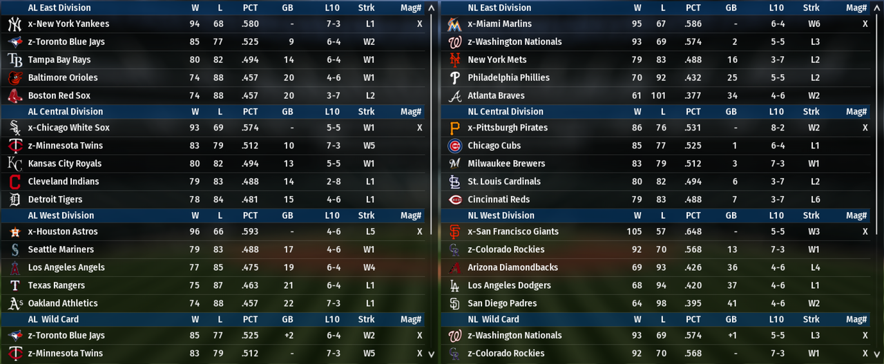 Cy Young: AL- Ogrodnik NL- Seb Addicott (SF) ROY: AL- Jorge Espinoza (CWS) NL- Luis Mijangos (WAS) HOF: Melendes Regular season standings... ![]() Batting leaders... ![]() Pitching leaders... ![]() And the playoffs... ![]() So a championship finally comes back to the Bronx after a 71-year drought, and they did it in style (winning every series in the deciding game). The ENTIRE American League has now won a championship, and 27 total teams have won. Just the Mets, Nats, and Cardinals remain. |