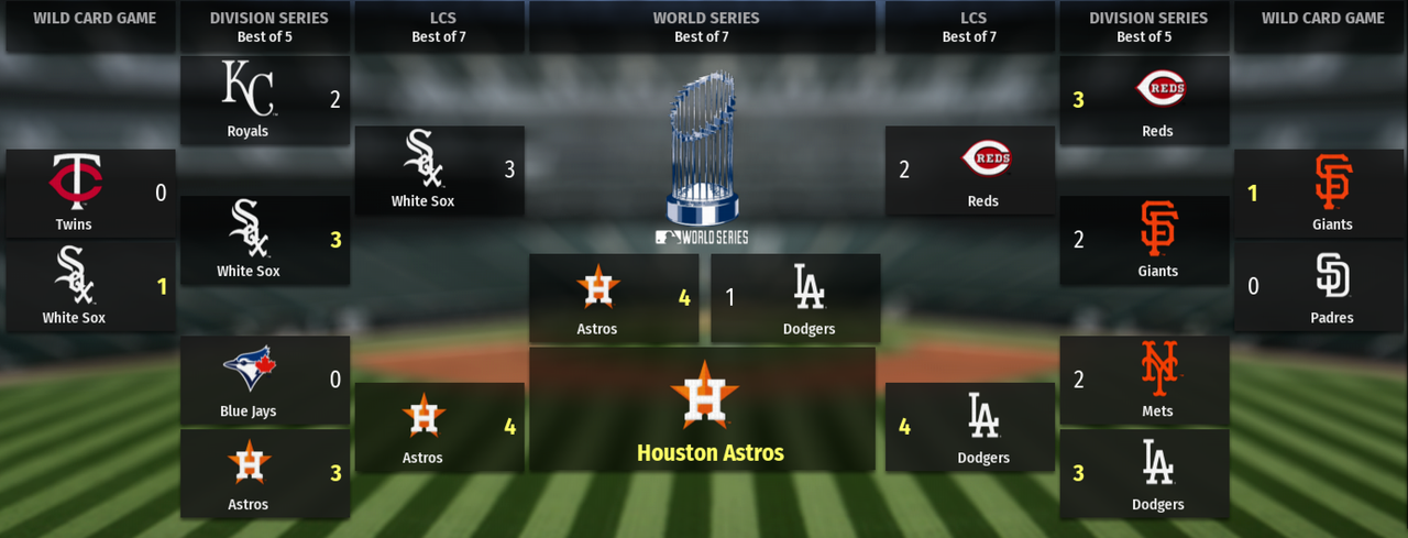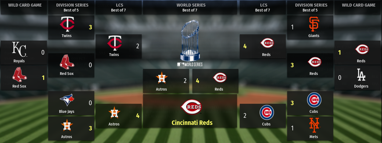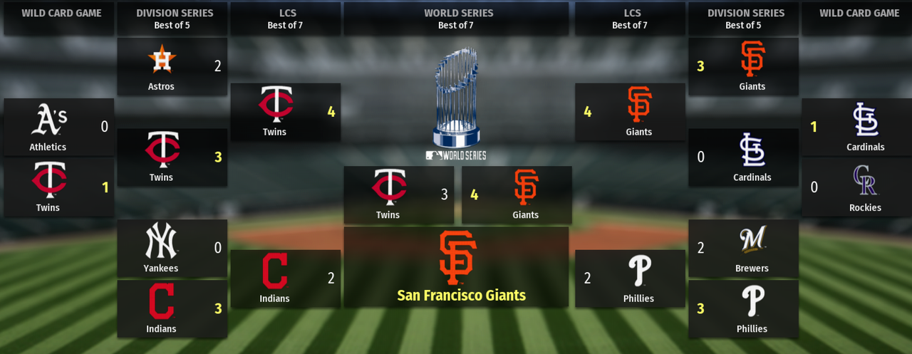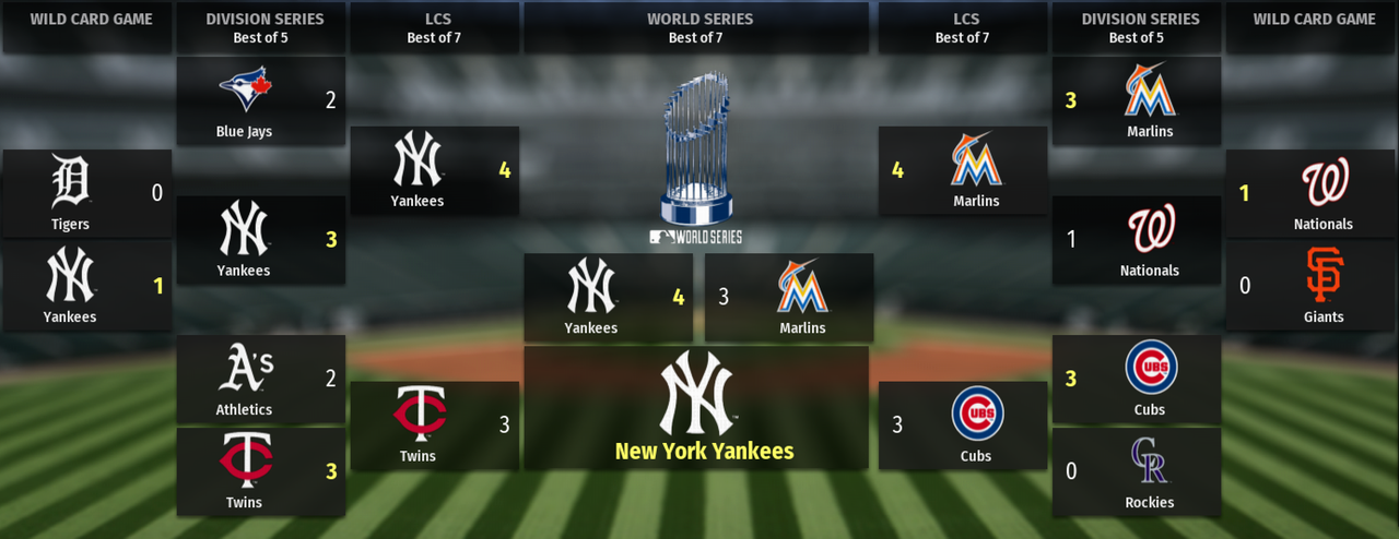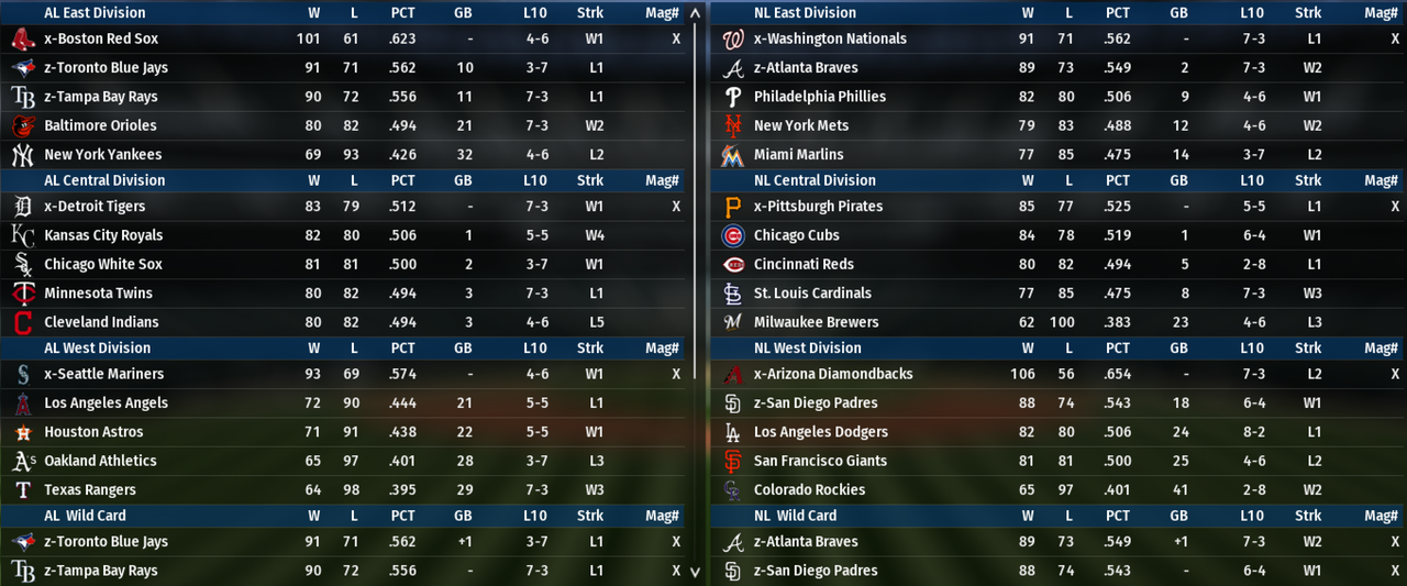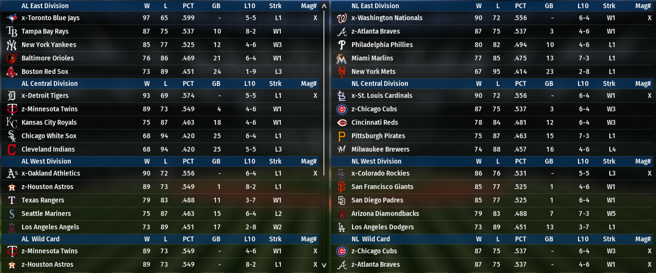 Cy Young: AL- Ogrodnik NL- Seb Addicott (SF) ROY: AL- Jorge Espinoza (CWS) NL- Luis Mijangos (WAS) HOF: Melendes Regular season standings... ![]() Batting leaders... ![]() Pitching leaders... ![]() And the playoffs... ![]() So a championship finally comes back to the Bronx after a 71-year drought, and they did it in style (winning every series in the deciding game). The ENTIRE American League has now won a championship, and 27 total teams have won. Just the Mets, Nats, and Cardinals remain. |