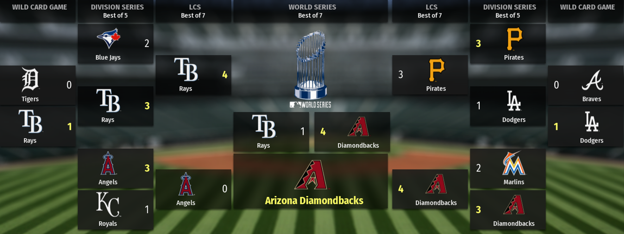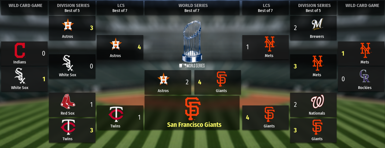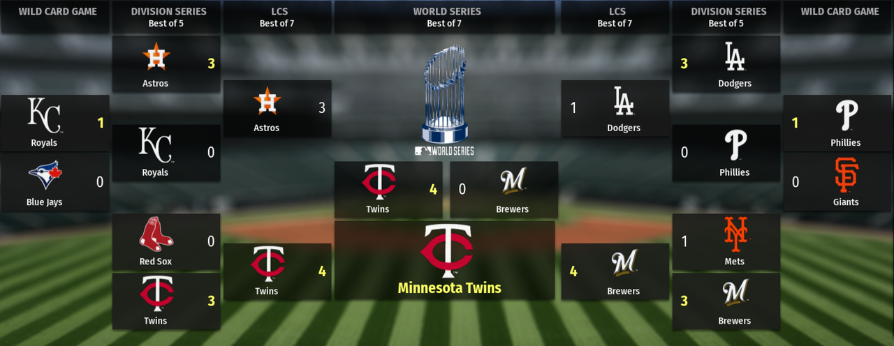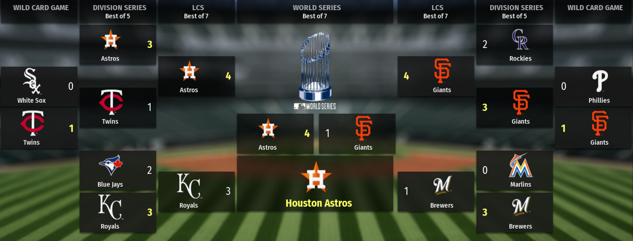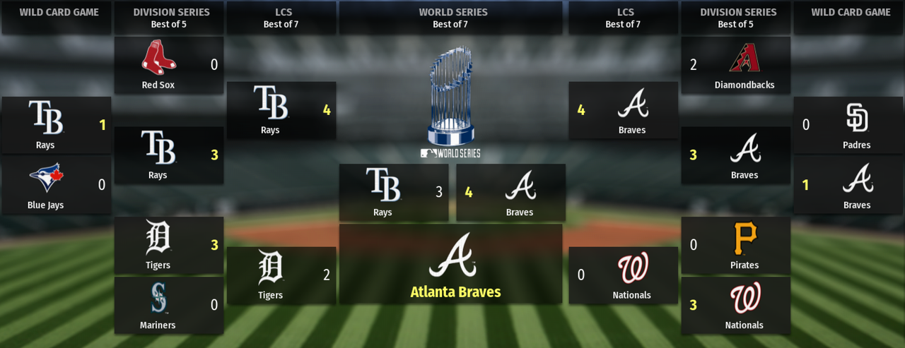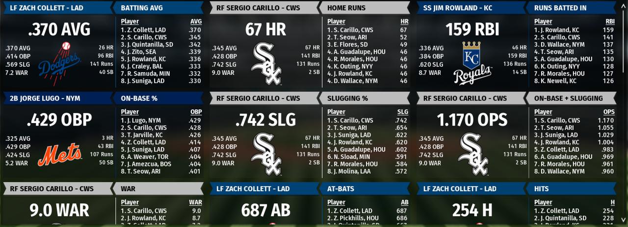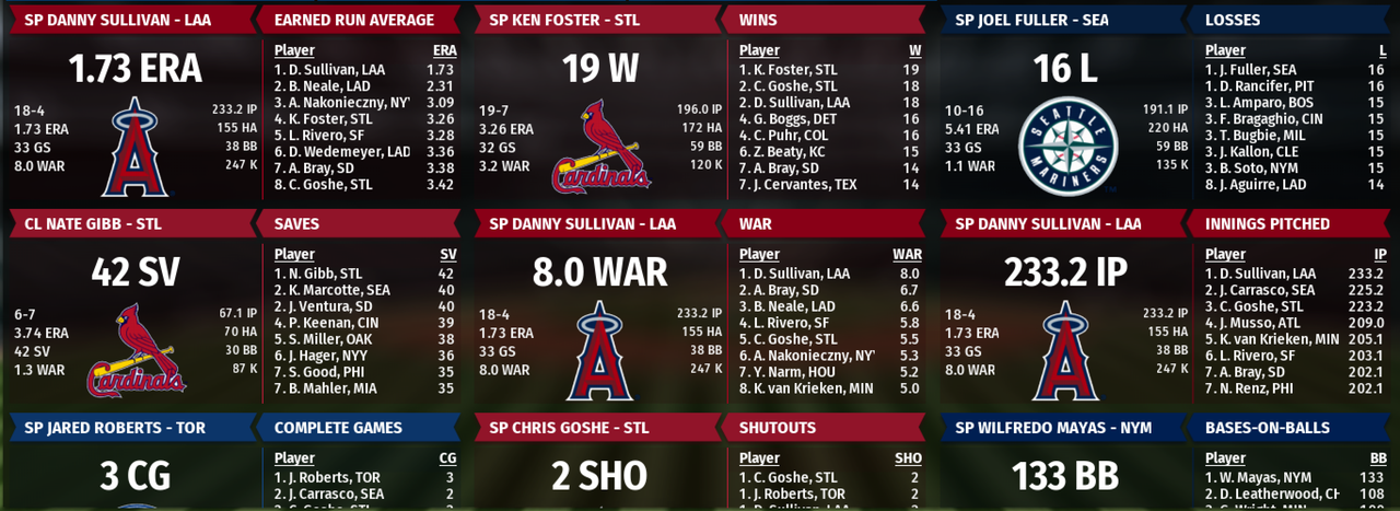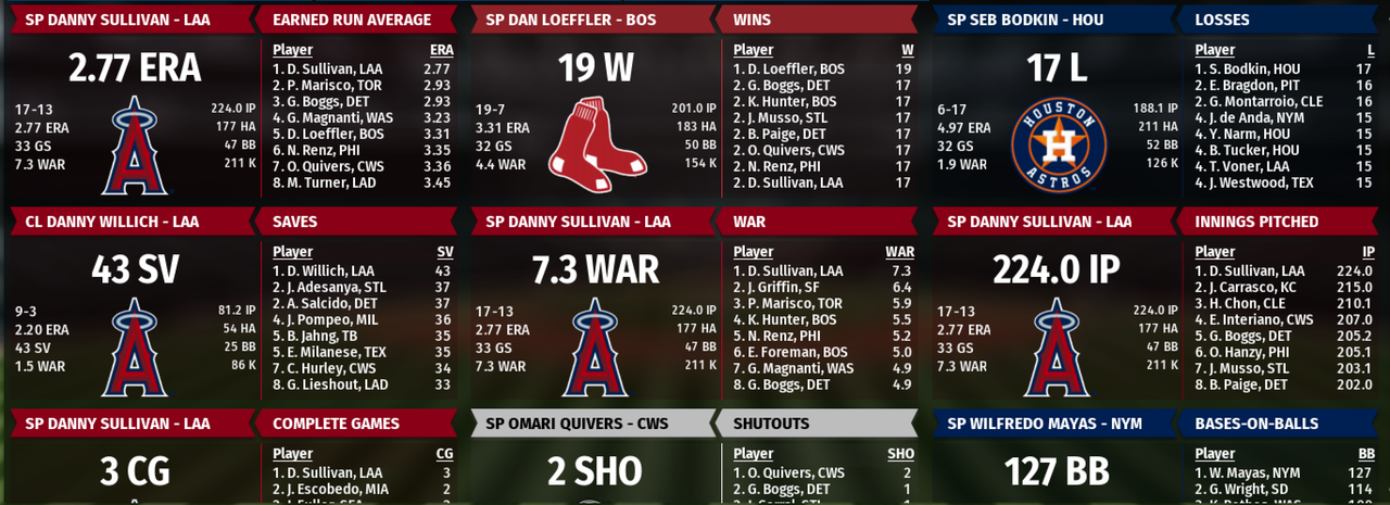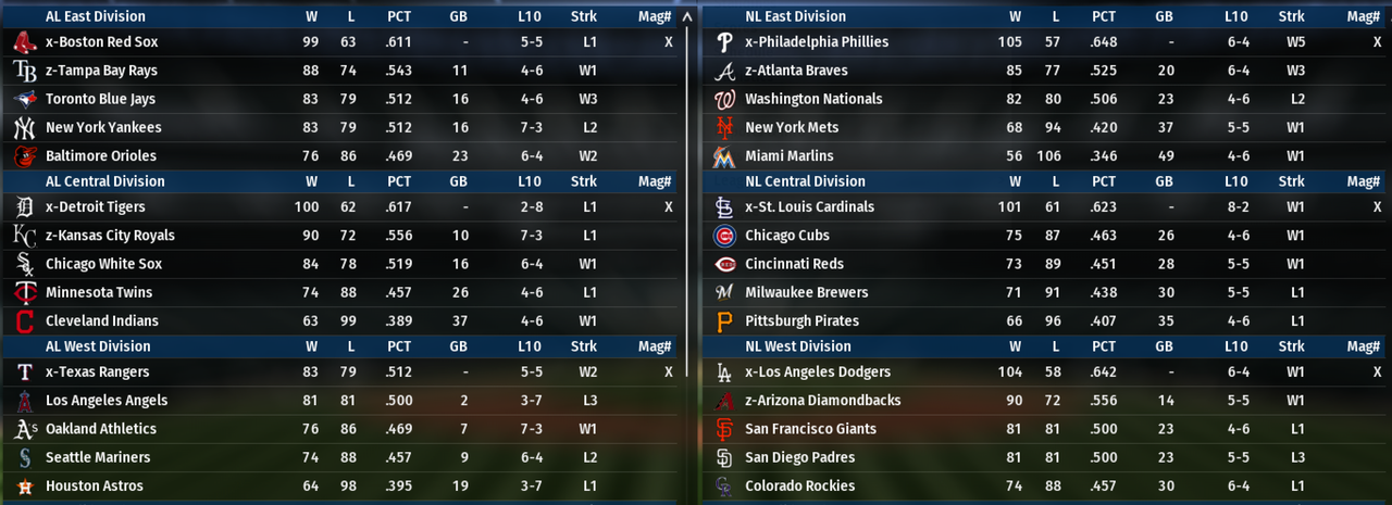 Cy Young: AL- Danny Sullivan (LAA) NL- Goshe ROY: AL- Chris Beck (BAL) NL- Joe Stach (ARI) HOF: Tim Dale, Sergio Parra Regular season standings... ![]() Batting leaders... ![]() Pitching leaders... ![]() And playoffs... ![]() So the Nats, Cards, and Mets showed why they haven't won yet... |