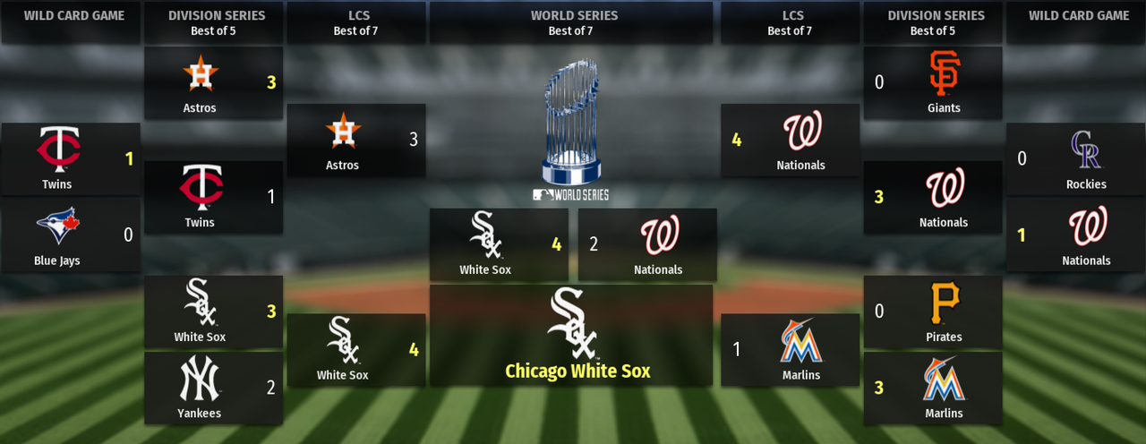 Cy Young: AL- Juan Tapanes (HOU) NL- Charo ROY: AL- Luis Subia (KC) NL- Chris Goste (STL) HOF: Sam Tolar Regular season standings... ![]() Batting leaders... ![]() Pitching leaders... ![]() And playoffs... ![]() So the White Sox win again. The Nationals lose in the World Series for the third time. Still at 26 different champions. |