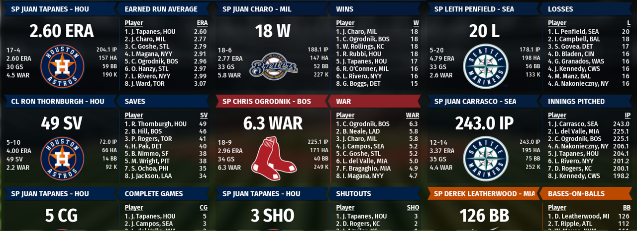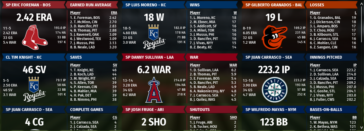 MVP: AL- Schultz NL- Juan Flores (SD) Cy Young: AL- Eric Foreman (BOS) NL- Bobby Thomas (PIT) ROY: AL- Juan Celis (TOR) NL- Ewold Minderhoud (MIA) HOF: Cavazos, Steve Young Regular season standings... ![]() Batting leaders... ![]() Pitching leaders... ![]() And playoffs... ![]() Disappointed, but...it happens |