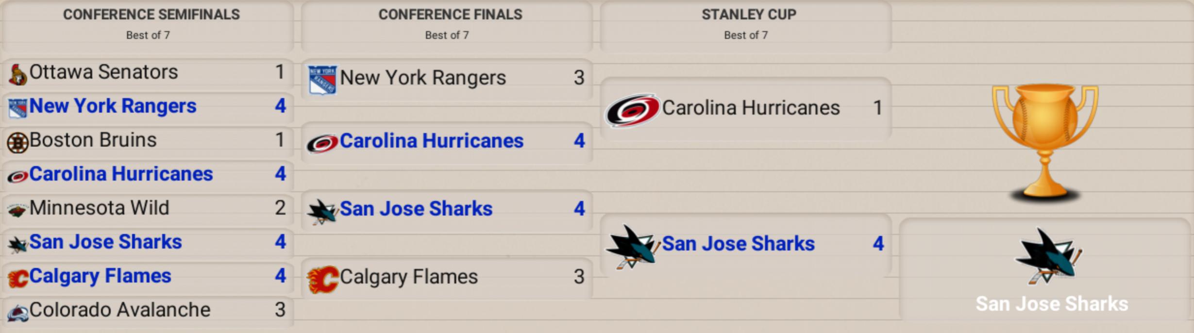 East: Carolina vs. NY Rangers CAR 8 @ NYR 7 CAR 4 @ NYR 3 NYR 13 @ CAR 4 NYR 2 @ CAR 6 CAR 2 @ NYR 3 NYR 4 @ CAR 3 CAR 4 @ NYR 3 Hurricanes win series 4-3 West: Calgary vs. San Jose CGY 0 @ SJ 1 CGY 10 @ SJ 3 SJ 2 @ CGY 3 (10) SJ 1 @ CGY 0 CGY 1 @ SJ 2 SJ 3 @ CGY 6 CGY 2 @ SJ 4 Sharks win series 4-3 Last edited by jg2977; 07-24-2024 at 08:16 AM. |