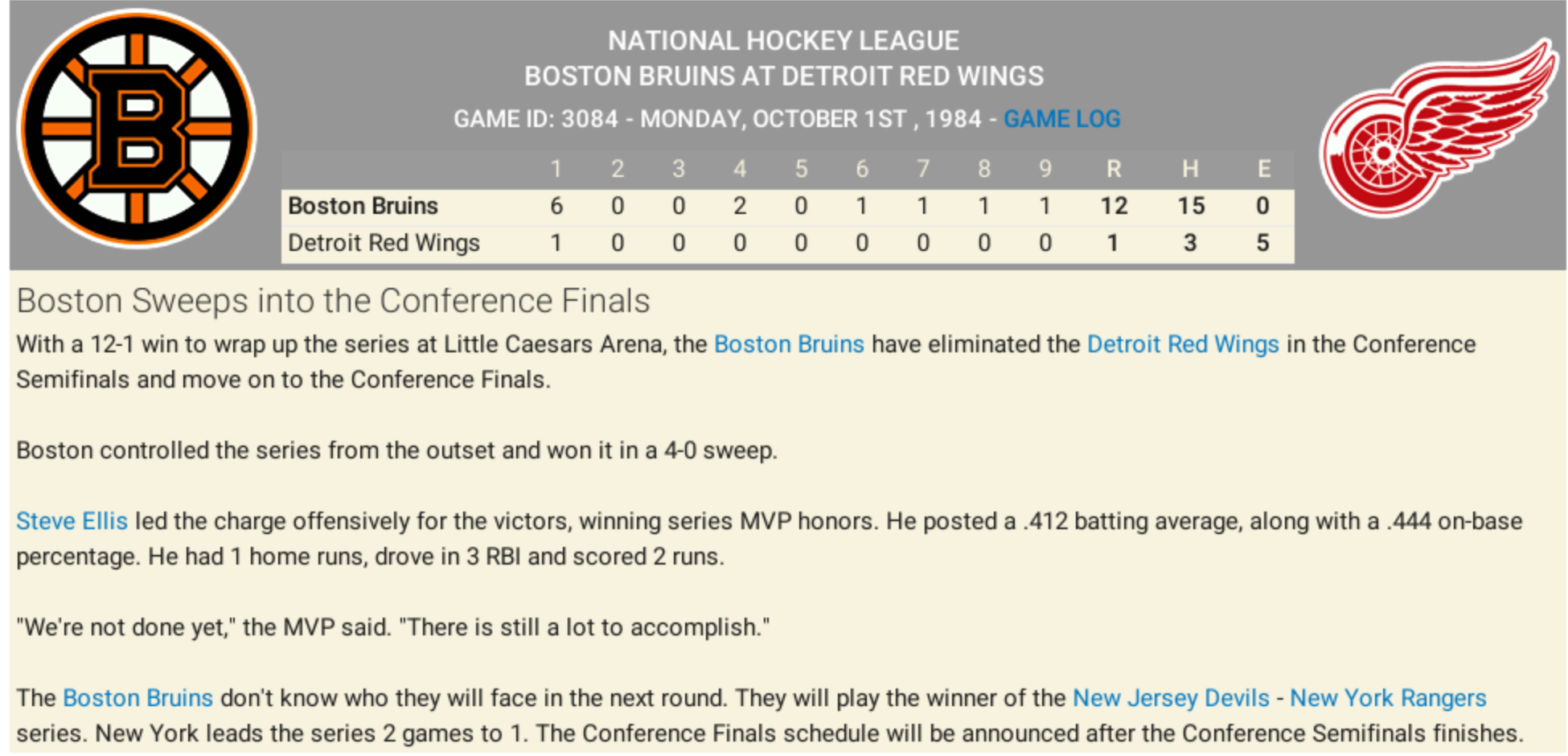East #4 New Jersey Devils vs. #1 New York Rangers NJ 0 @ NYR 5 NJ 3 @ NYR 1 NYR 5 @ NJ 4 NYR 7 @ NJ 2 NJ 2 @ NYR 6 Rangers win series 4-1 #3 Detroit Red Wings vs. #2 Boston Bruins DET 2 @ BOS 9 DET 5 @ BOS 6 BOS 2 @ DET 1 BOS 12 @ DET 1 Bruins win series 4-0 West #4 Minnesota Wild vs. #1 Winnipeg Jets MIN 4 @ WIN 2 MIN 3 @ WIN 2 WIN 3 @ MIN 0 WIN 5 @ MIN 4 MIN 4 @ WIN 3 (11) WIN 4 @ MIN 5 Wild win series 4-2 #3 Nashville Predators vs. #2 Calgary Flames NSH 6 @ CGY 4 NSH 0 @ CGY 3 CGY 1 @ NSH 7 CGY 1 @ NSH 2 NSH 2 @ CGY 4 CGY 2 @ NSH 5 Predators win series 4-2 Last edited by jg2977; 07-31-2024 at 08:11 AM. |