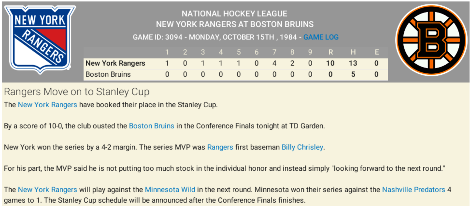Boston vs. NY Rangers BOS 2 @ NYR 1 BOS 2 @ NYR 7 NYR 1 @ BOS 6 NYR 6 @ BOS 0 BOS 4 @ NYR 5 NYR 10 @ BOS 0 Rangers win series 4-2 Minnesota vs. Nashville MIN 1 @ NSH 4 MIN 8 @ NSH 4 NSH 3 @ MIN 7 NSH 1 @ MIN 5 MIN 5 @ NSH 1 Wild win series 4-1 Last edited by jg2977; 08-02-2024 at 08:21 AM. |