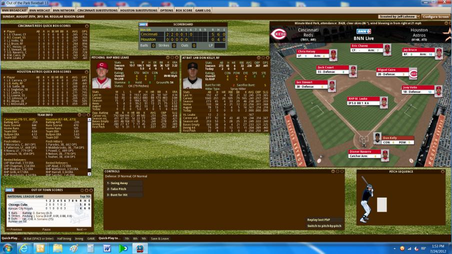 Playing a game against the AI run Reds, Drew Stubbs is injured in the top of the 6th inning, and I notice that Eric Chavez is put in as his replacement in CF. Of course, the red light goes off, and I have a closer look and see that both Eric Patterson and Juan Rivera remain on the bench (see below). After completing the game I check the Reds lineup/depth chart v. RHP and see that there is no back up listed for Stubbs at all. Neither Patterson or Rivera is rated at CF, so the AI simply fails to list a backup, and when the need arises, doesn't make the logical choice either. The AI needs to either A) insert the most logical sub for the starter in the Lineup/Depth screen, even if the player isn't rated for that position, or B) have the in-game AI tweaked so that it makes a logical choice for an injury substitution regardless of the Lineup/Depth chart. One or the the other.