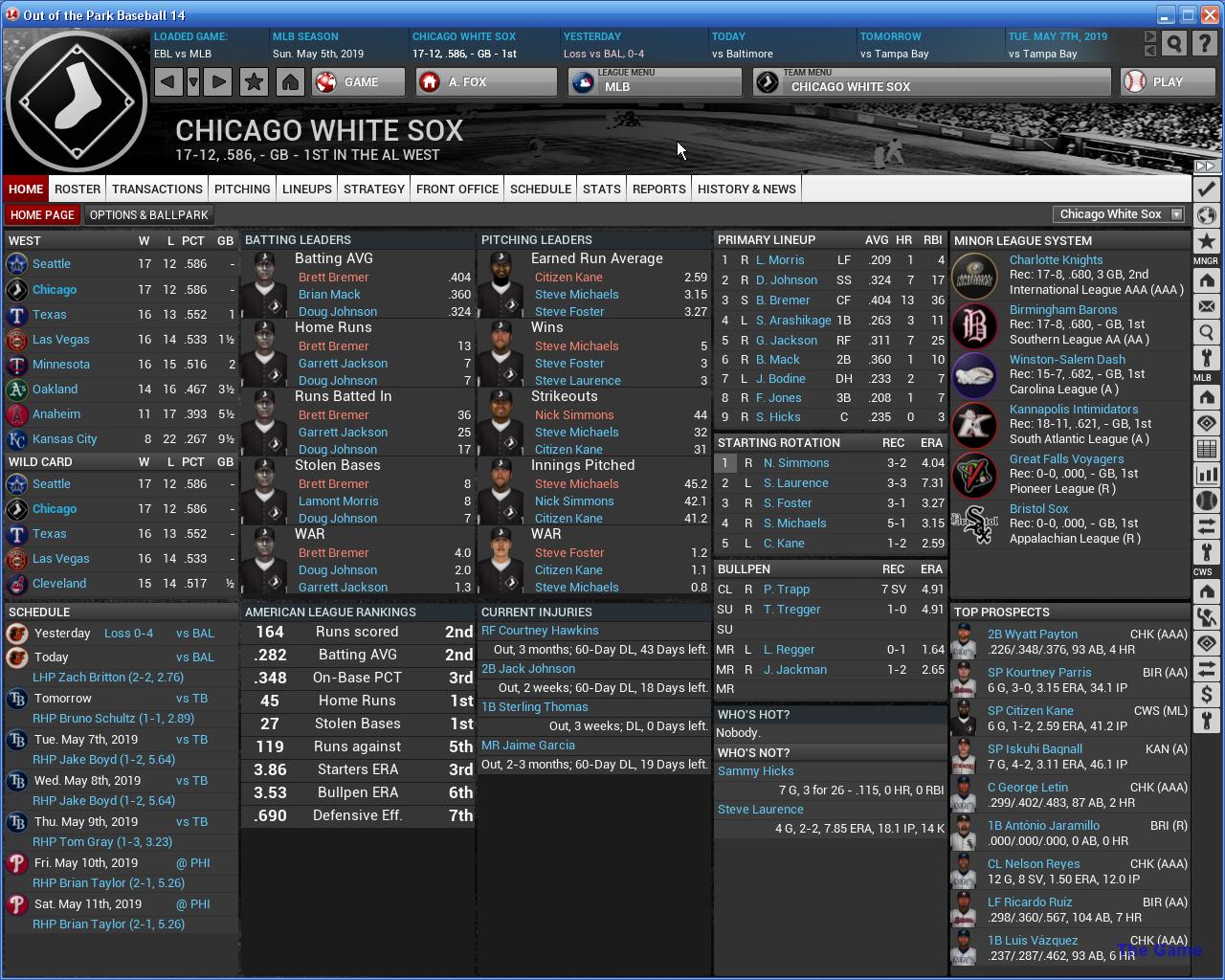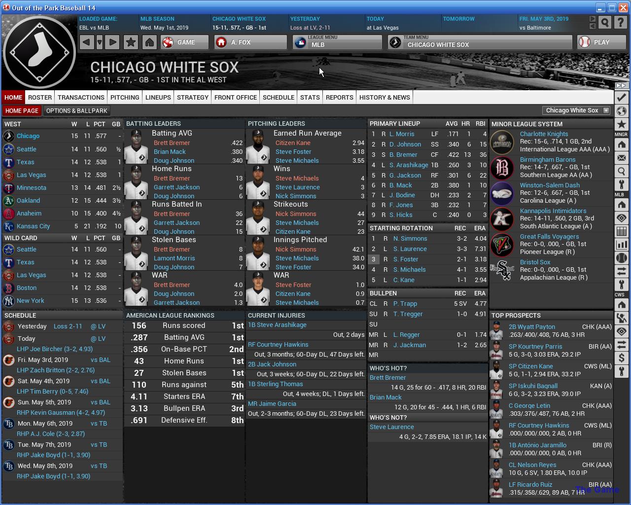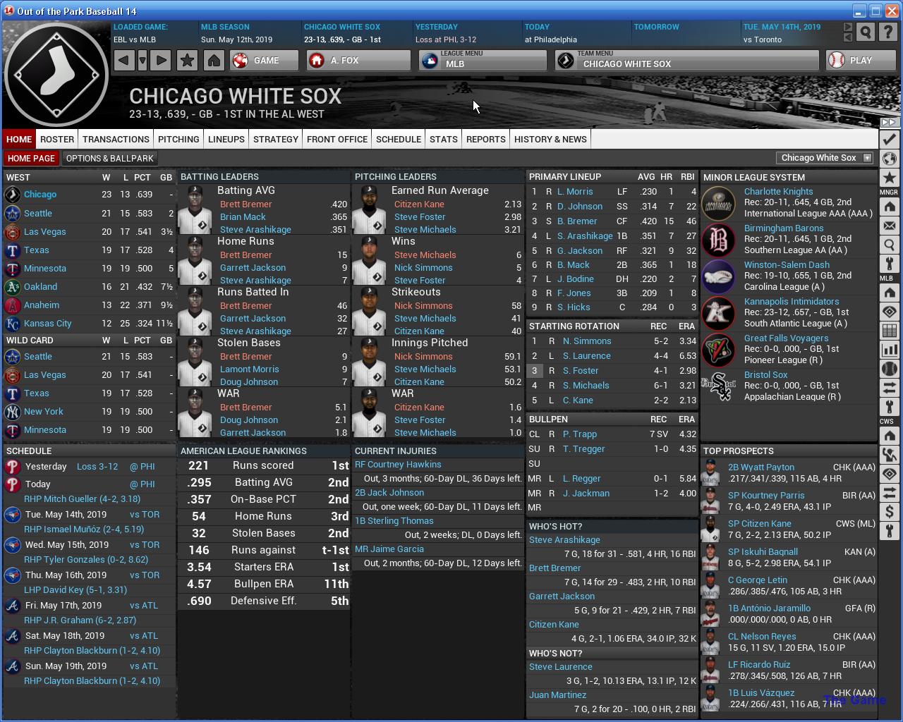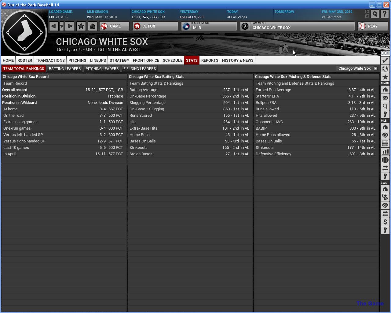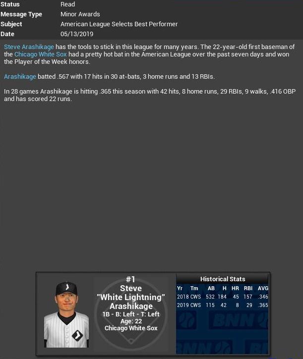 Toronto did give us fits. 3-3 this week. Toldeo has made an impact so far hitting .750 since joining the Southside Hitmen. GM Harold Baines plans on addressing the bullpen issues after Thomas & Jack Johnson come back.