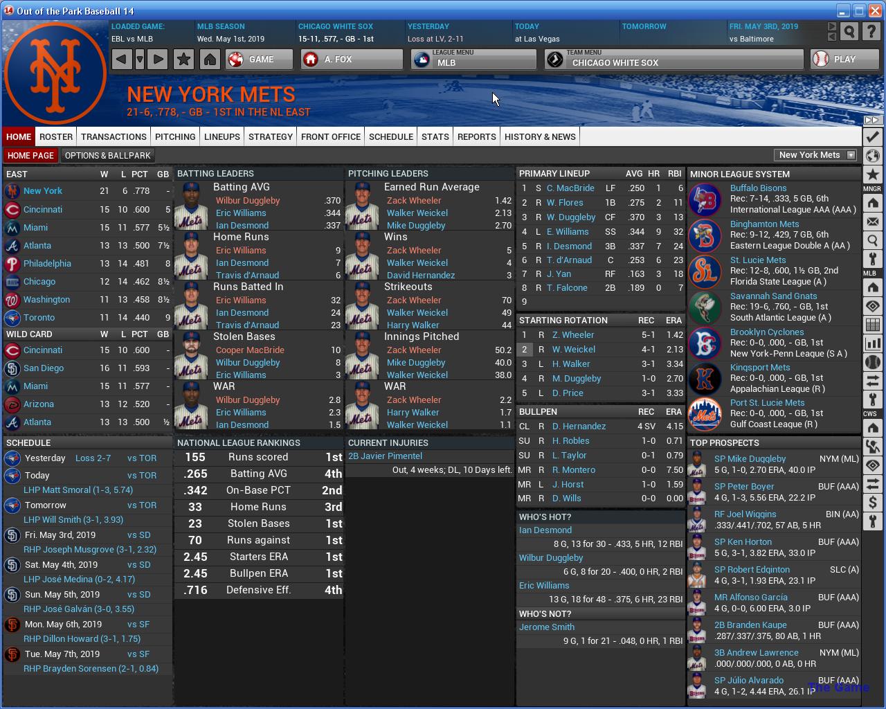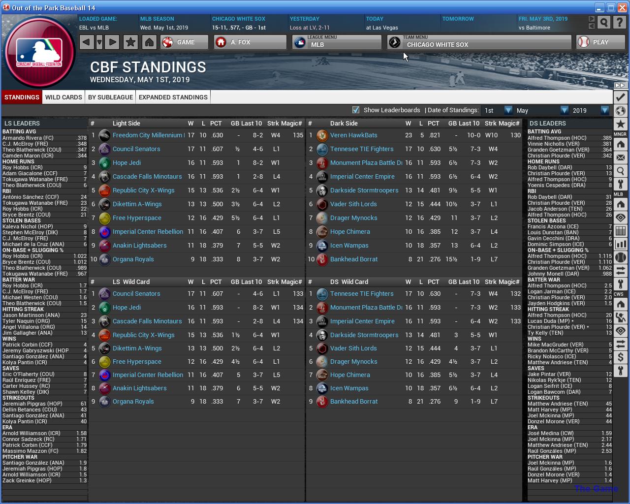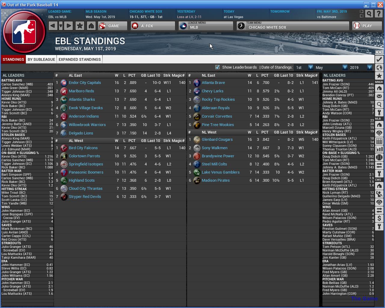 A look at the NL East leading Mets. Kinda surprised Duggleby only has 3 HR. Capitals, Falcons, Brave & Cougars lead their divsions, Caps are all world right now. The expansion Lions are really bad. A look at the all world Capitals. No SP has a loss. Tigger Johnson only has a WAR of 1.1...hmmm ok. Millennium Falcons & HawkBats lead their leagues. Wildcard as always is wide open. Thought Royals would be in the mix, but Shoeless Joe Jackson has been injured most of the month.