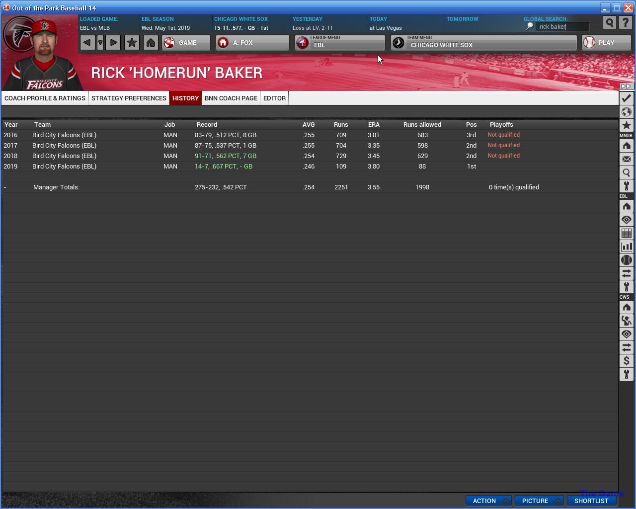 How Acq: #3 pick in the 2003 Inaugural Draft. Rick is one of 11 remaining active Alderaan players. Rick's brother 1B John Baker SPF, MR Kelly Danby BRA, SP Norman McDuffie Sr. ALD, MR Dave Versailles BRA, SS Alan Day ATL, MR Robert Meyer LV, SP Enos Watts EC, 3B Comte De Grasse STY, SP John Hughes Jr CT & CF Andrew Jackson HIG. Rick's father Mike owned a restaurant on Coruscant when the planet was destroyed. Rick is the EBL's all time leader in homeruns at 601, Games 2488, Total Bases 5202, BB 1667 & RBI 1738. #2 in HR is Jimmy Dugan at 503. Rick is the 2011 Triple Crown award winner. Rick is the 2003 AL Rookie of the Year. a 4 Time AL MVP and a 13 time All Star. He is also the MGR of the Falcons. Rick and his older brother John discovered baseball following the Battle of Endor game when they met Han Solo and Captain Solo was telling them about the sport. They were both natural athletes and took to the game very quickly. Rick proved to be the better player. Rick wears #25 for his favorite player Mark McGwire.