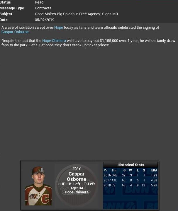 Citizen Kane had a great game vs the Rays. Chimera sign another pitcher. Ewoks sign 2B Josh Rutledge. I wonder if this will force Teebo to the bench or to DH. Mets lose 20 game winner Walker Weickel for 3-4 months. he should be back in time for the playoffs.