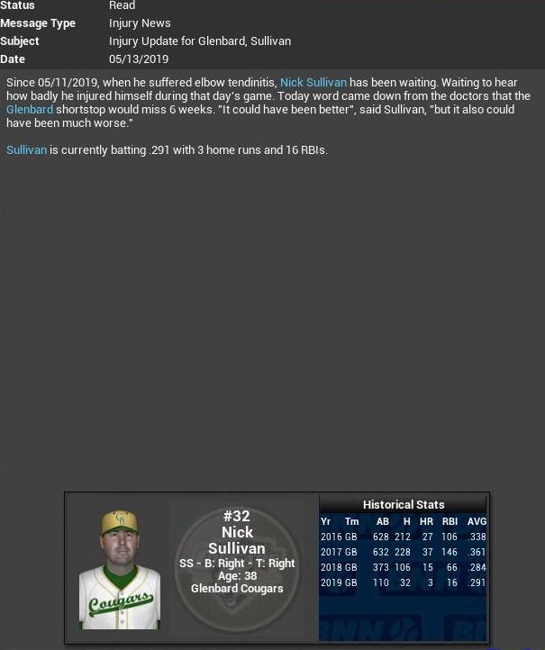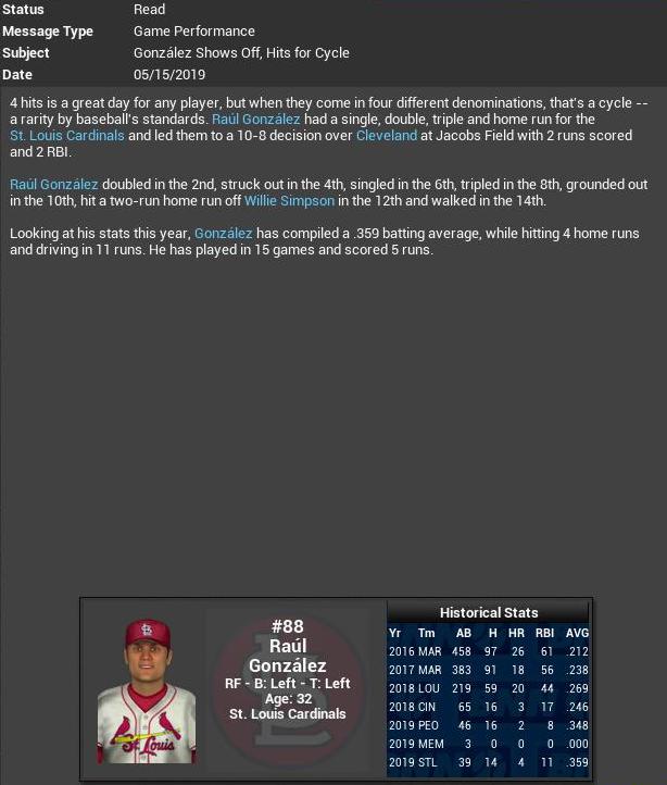 Cougars SS Nick Sullivan will be out for 6 weeks. Duggleby hits 3 HR. Cardinals RF Gonzalez hits for the cycle. Bob Bellias is having a great season after missing most of last year.