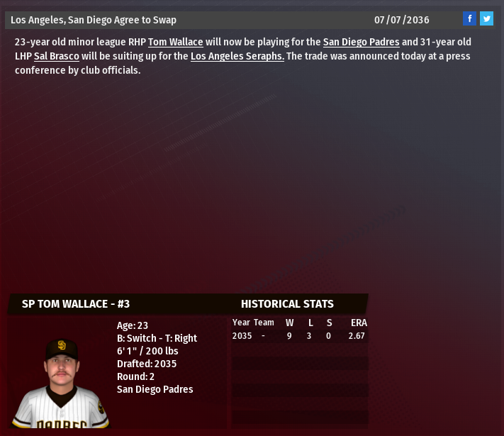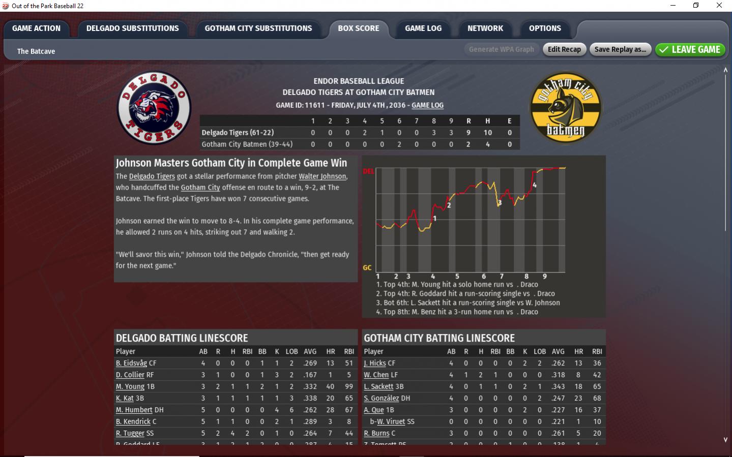 Willowbrook SP Michigan J. Frog pitched a 4 H 10 K CG SH. Delgado Tigers trade RP Larry Thomason & Cf Rowan Goddard to the Brandywine Power for Cf Eugeniu Stefan (retain 15%) & a minor league SP.