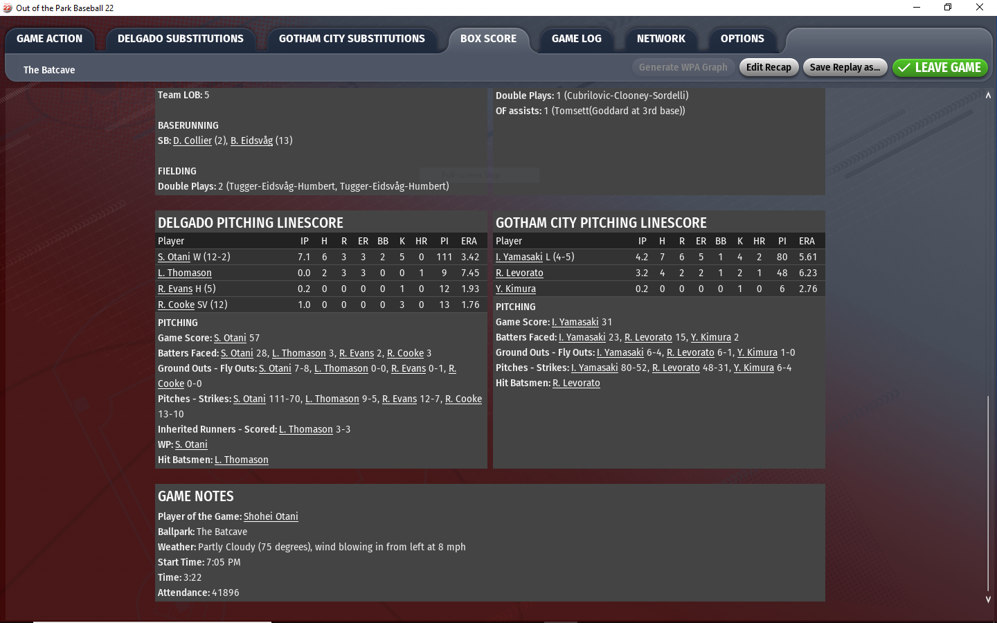 Paradise City SP Zeke Capers pitched a 5 H 2 K CG SH. Endor City 3b Harold Brown is named EBL AL POTW. Metropolis Cf Clark Kent is named NL POTW. Yokohama Rf Florian Amico is is named UBL EL POTW.