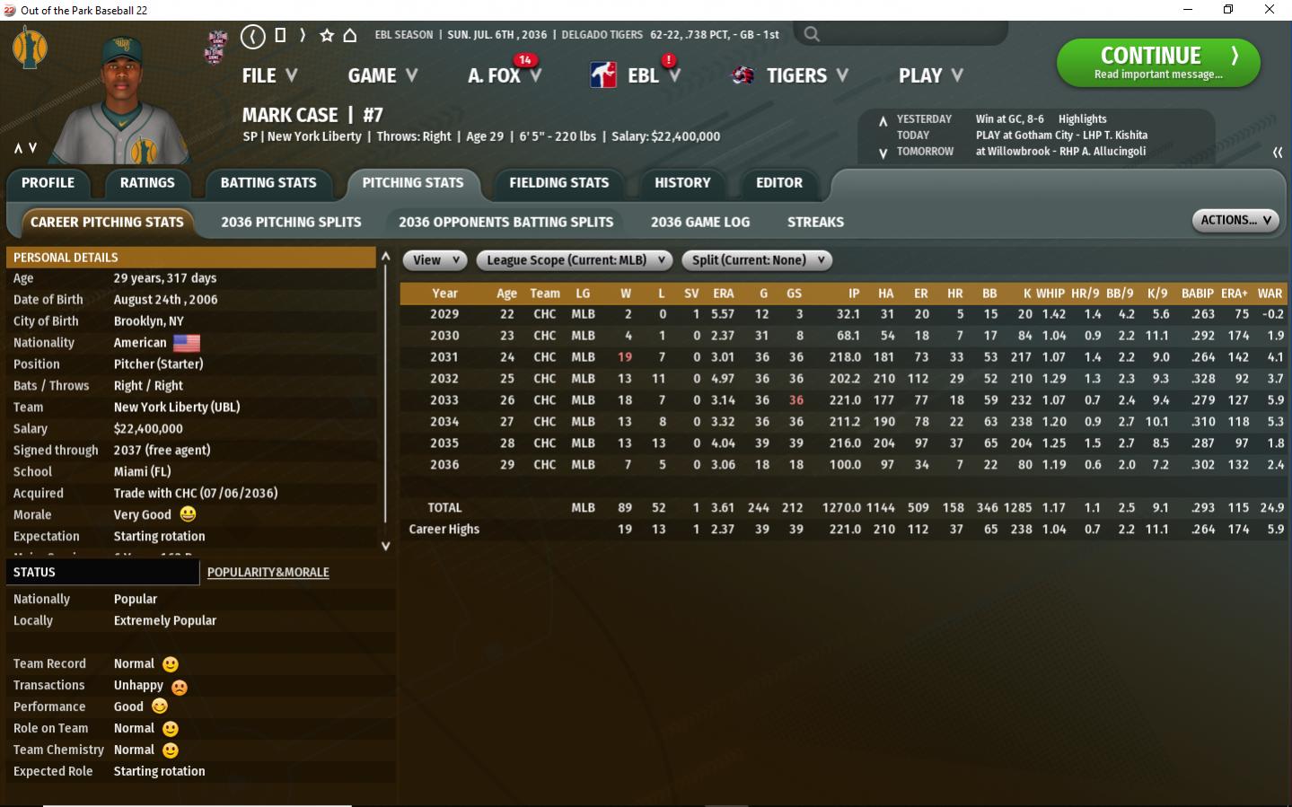 Skywalker SP Rocket pitched a 3 H 12 K CG SH. Updated Top 10 EBL prospects. Tigris DeGaulle is 7th. Havana Sugar Kings trade RP Walt Von Manstein to the Kansas City Royals for a minor league SP.