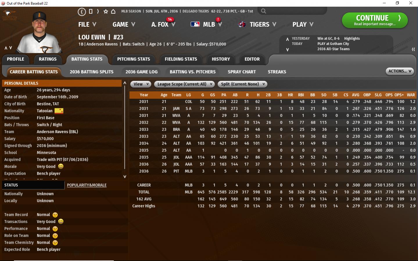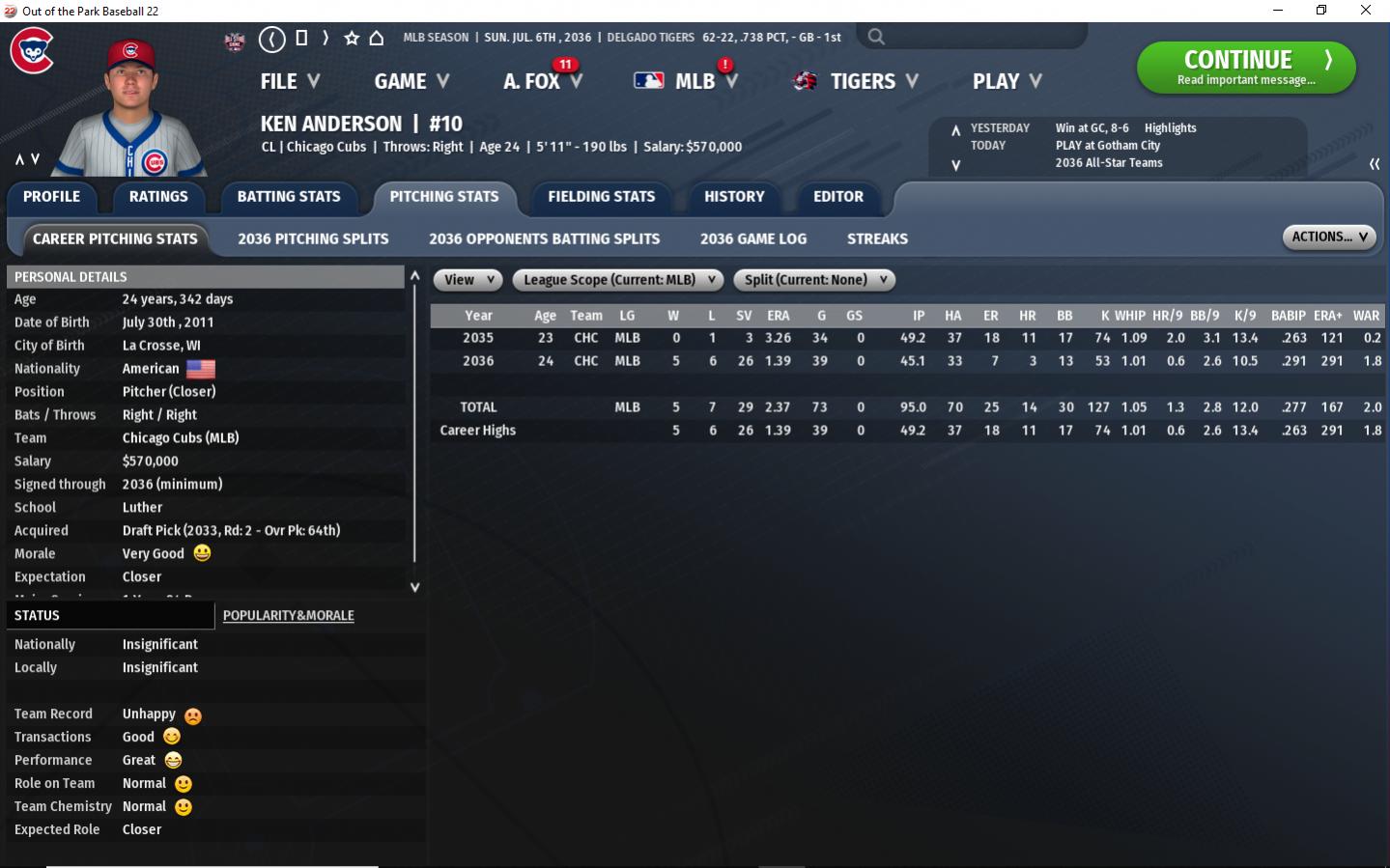 Bird City SP MJ Knight pitched a 2 H 6 K CG SH. Metropolis Cf Clark Kent has a 3 HR game. Rocky Top Rockies traded RP Joe Day & $1,730,000 to the Cooperstown Giants for 2 minor leaguers.