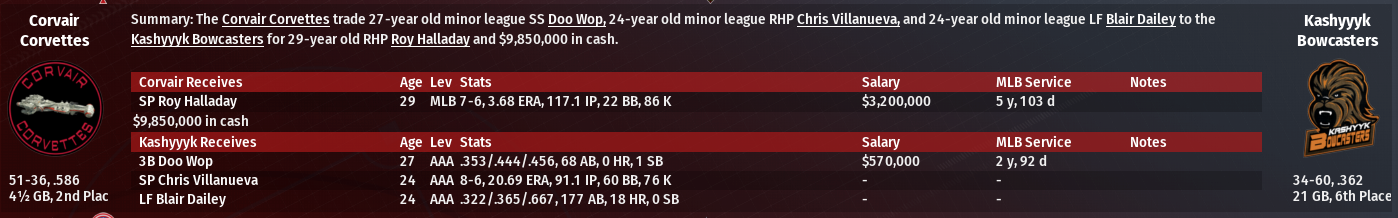 Indianapolis Rf Dimitrije Nacuk has a 3 HR game. Havana 1b Dani Diaz has a 5 Hit game. Atlantis loses SP Franz Quartin for the season. Corvair Corvettes traded SS Doo Wop & 2 minor leaguers to the Kashyyyk Bowcasters for SP Roy Halladay & $9,850,000.