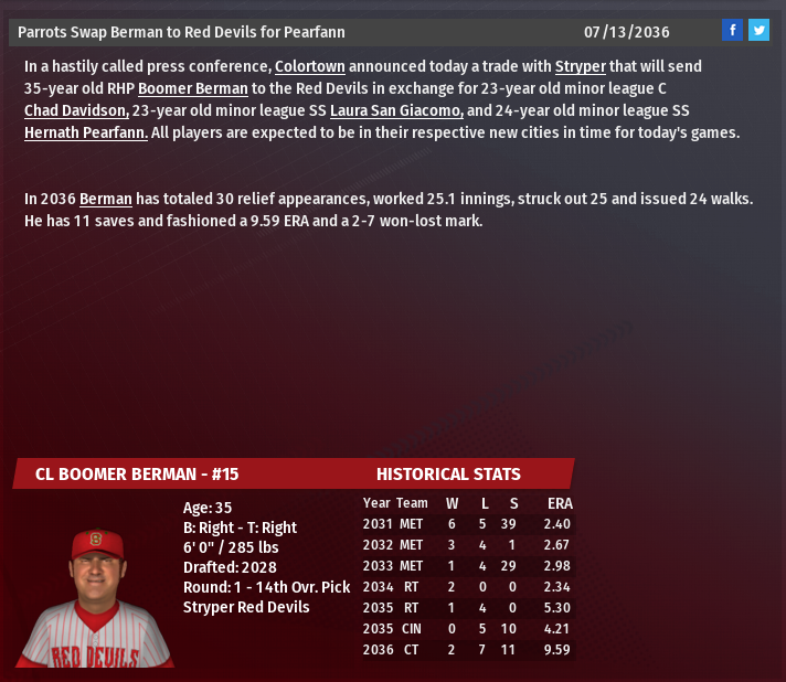 Colortown Parrots traded CL Boomer Berman to the Stryper Red Devils for 3 minor leaguers.