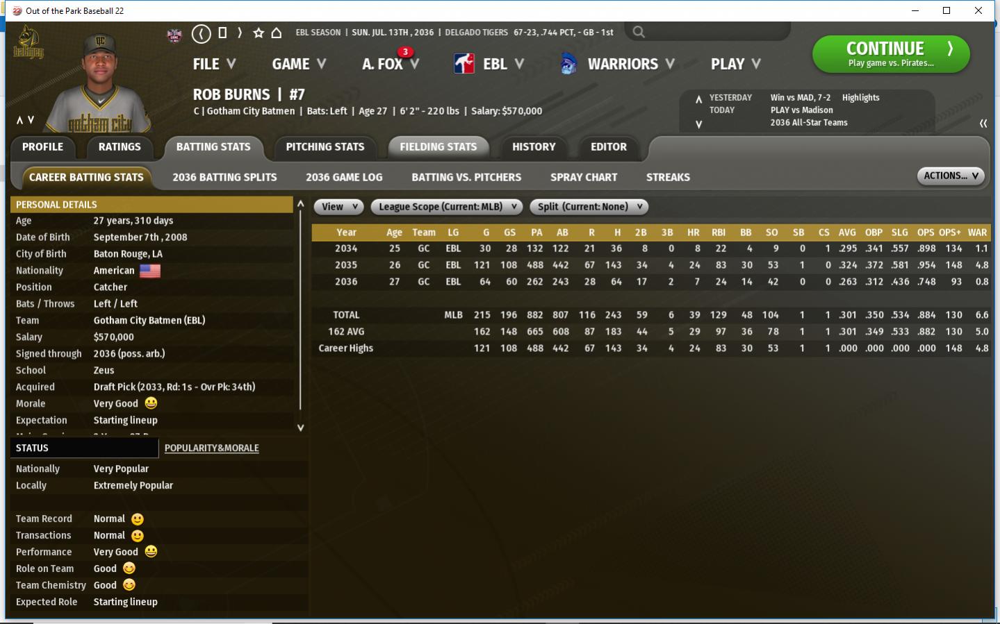 Defense - C - Their OF defense is above average. They are good at 2b, SS & 3b. Parkman isn't terrible behind the plate but he acts like he doesn't care.