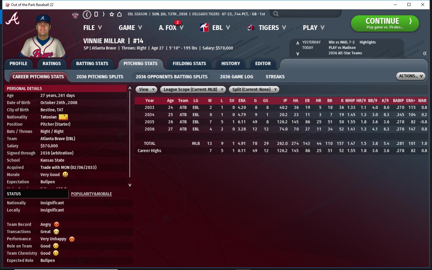28-58 .326 25½ GB AL West. The Pirates are in disarray. They have young talent but a combination of key injuries and under performing have left this team among the worst in the EBL. Offense - D - this team is struggling across all categories of offense. Bill Lacey is the only player exempt from this. Pitching - F - Losing 2 key SP and 1 RP hasnt helped but pitchers who are normally good are struggling too. Defense - C - Their OF defense is above average. They are good at 2b, SS & 3b. Parkman isn't terrible behind the plate but he acts like he doesn't care. 2036 New Additions CF Eirik Ringdal - He is a speedy rookie who is good on D. He is a future 4th OF. Rf Stepan Ediger - Good defensive Rf who can hit for a good AVG. some power. 2b Nicholas Stennings - above average defense. Normally 20-25 HR power, low AVG. SS Ernest Borowiak - excellent defense. Good AVG. No power. SP Satchel Paige - Normally Paige is a solid #3 over the past few seasons. He looks bad this year. SP Jeanie Mentavlos - She is a rookie and it shows. She might be a decent #5 or she'll be a spot starter. RP Jeremiah Bullfrog - His best days are behind him but overall a good LHP in the pen. RP Bea Haven - one of the few bright spots in the pen. She has had a great career.