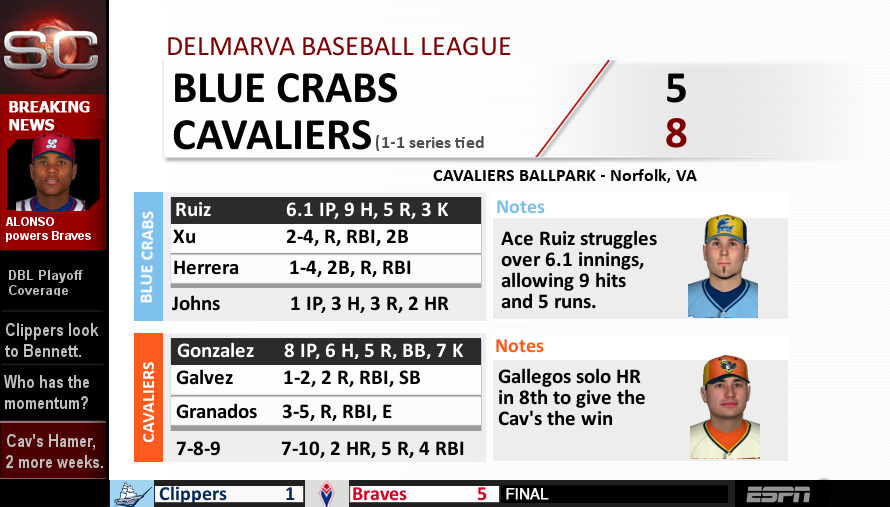 Game 1 Starting Lineups Here is a look at the starting line-ups for game one. The Blue Crabs start with lefty Antonio Cortes on the bump, facing off against the Cav's ace Miguel Contreras. I only have 2 lefties in the line-up, so hopefully that is a good thing. We have always struggled against lefties, especially during the playoffs... Contreras will have to tame the DBL version of "Murder's Row"... amazing how tough these would be if Molinero was healthy. ![]() Miguel Contreras started off by striking out the side and the crowd of 43,355 got loud. But their winds were taken out of their sails in the 2nd when the Blue Crabs opened up the scoring with 3 runs. Jose Lopez singled, followed by a Claude Bond double. After a strike-out of Mike Simmons, Xue-qin Xu singled up the middle scoring both Lopez and Bond. Xu moved over to third on a Jose Martinez ground-out then Ceaser Silva singled him home to cap off the scoring. The Cav's made a comeback in the 5th with 2 outs. Sergio Rodriguez singled on a 2-1 count, bring up Sergio Galvez. Galvez drove the 2-2 pitch 389ft over the right-center wall cutting the Crabs lead to 1. In the 7th, Galvez would tie the game with a 1-out 389ft HR, that landed just about where his first one did. The game was tied after 7. However, the lead didn't last long, with light hitting, Ramiro Herrera leading off the 8th with a triple. Contreras would strike out Sanho Busones, but couldn't keep Antonio Casteaneda from singling Herrera in, on 1-2 count. The Cav's tried to get that run back in the bottom half of the eight when Alejandro reached on an error by the center-fielder. Leonard Lawson was brought in the game to run of Diaz and on the 0-1 hit-and-run Lawson would be gunned out trying to steal. Gallegos would reach second on a throwing error by the second basebmen, on the next pitch. Ramon Granados moved him to third on a ground out bring up Mario Gomez with the tying run on third... "Yoo-hyun Kim the ex-Cavalier is in a position to quiet the fans once again with Mario Gomez at the plate... Kim will be pitching from the stretch to Gomez, here is the pitch, off the plate, ball 1... up in the count Gomez should be looking for a pitch to hit here. He comes into he game on a hot streak going 11-17 during the final week of the season... looks like Kim is ready, here is the pitch, Gomez takes an ugly swing at the slider away hitting a soft ground to second. Hicks fields the ball tosses it over to Martinez and the inning is over. The Cav's strand Gallegos at third... Lawson getting gunned out may come back to haunt the Cavaliers, who reach base two times in the inning on errors, but strand one... after 8 the Blue Crabs hold the 4-3 lead..." The 9th for the Cavalier's was uneventful as Lambert would pinch hit for Lopez and single, but that is all they could get. Rodriguez flew out to center, Galvez went down swinging and Jeff Lewis grounded out to third on the full-count... ![]() (image adapted from a post on the sportslogos.com message board) Delaware Conference Championships The clippers jumped out to a 2-0 lead in the first, thanks to 3 straight hits, the big one a doulbe by Jesus Nunez that scored 2. The Braves would score on in hte bottom half to cut the lead 2-1. The big play was Jorge Alonso getting gunned out at third, just moments after Salinas crossed the plate. The play was reviewed in the booth, and it was offical Salinas scored before the out was made. The Clippers would add one in the 2nd, on 2 more hits, but the Braves would add 2 of their own, the big hit was Pepe Martinez, who doubled in 1 and scored another. After 2 the game was tied at 2. The Braves would take the lead in the 3rd, thanks to a Andres Salinas double. Salinas moved to third on Alonso ground out, and scored on a Derek Campbell ground out... after 3 the Braves lead 4-3. Three singles in row with one out in the 4th would give the Braves another insurance run... A solo HR by Andres Salinas in the 5th gave the Braves a 6-3 lead. The Braves would plate 2 more in the 7th on 2 hits and 2 walks. The big hit by Ryan Warrender a single scoring Salinas and Derek Campbell. Moran would settle down after the 2nd and held the Clippers at bay. Moran went 7 innings, allowing 6 hits, 3 runs and striking out 7... the Ex-Brave, and Golden Arm Winner, Robert Walker didn't make it out of the 5th going 4 innings, allowing 11 hits and 6 runs. He didn't walk or strike out anyone. Andres Salinas of the Lewes Braves went 2-3 with a double and a HR, he scored 4 runs tying the Delaware Conference playoff record.
