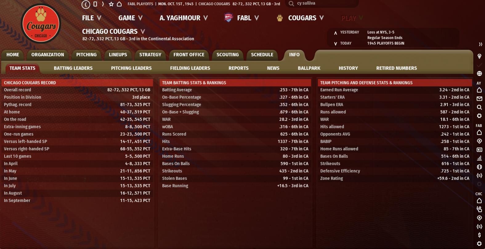 Seasonal Record: 78-69 (3rd, 13 GB) Stars of the Week None Generated Schedule 9-10: Loss at Foresters (3-7) 9-11: Loss at Foresters (2-3) 9-12: Win at Wolves (4-1) 9-13: Loss at Wolves (1-4) 9-14: Win at Wolves (8-7) 9-15: Win at Cannons (5-4) 9-16: Loss at Cannons (1-8) 9-16: Loss at Cannons (0-3) Recap And with another 3-5 week, the Chicago Cougars have been officially eliminated from postseason contention. What makes it even worse is we're barely holding on to third place, just half a game above the Sailors. We've secured a .500 or better record for the ninth consecutive season, but we're at risk of snapping our six season streak of finishing in the top three spots. Dropping both games in Cleveland was pathetic, and of course, we beat the Wolves (2) more then the Cannons (1). That helped the Cannons maintain their 3.5 game lead, as both teams finished the week an impressive 6-2. We have just four games this week and three the following week, so the boys will get plenty of rest to finish off the season. I still want to win every game left; there is both pride and a stronger draft spot at stake, so don't expect backups to flood the lineup. This week will be all about Dick Lyons, who will make his 563rd appearance and final appearance as a Chicago Cougar on the 23rd in our final home game of the season. We'll have a nice big number retirement ceremony for the beloved southpaw who is the only remaining player from the pre-human era to stay with the same organization they started with. In a season with not much to celebrate, this will be our World Series, and I hope we can win him one last game. His 237 wins are second most in Cougar history (crazy enough Harry Parker is 5th with 114), and despite not looking himself this year, he's been a dependable starter for 18 seasons. It will feel weird without him next season, but he'll be officially passing the torch to the youngsters Duke Bybee and George Oddo, and he'll have veteran Mike Taylor, his teammate for the last 13 and a half seasons catch him. Their combined 84 years and 227 days will be tough to top, and their combined leadership has helped us consistently win more then we lose. In the 13 full seasons they were teammates, we had just two (1935, 1936) losing seasons, equal to the amount of 97 win (1933, 1941) seasons during their tenure. Tough week all around, but George Oddo's likely final start of the season went pretty well. The 10 hits in 7 innings wasn't great, but he allowed just 3 runs (2 earned) and 2 walks with 6 strikeouts against a potent Cannons offense. The 22-year-old made 17 starts for us this season, an even 7-7 with a 3.02 ERA (117 ERA+), 1.17 WHIP, 51 walks, and 71 strikeouts. These were excellent numbers for the talented rookie that Tom Weinstock believes will develop into an ace. With Papenfus, the Jones Brothers, Joe Brown, Harry Parker, and Joe Brown all in line for starts next season, there's no obvious spot for Oddo. There's also Duke Bybee, who may join Oddo in Milwaukee, as he's looked overmatched so far. It's just three starts, but his two this week were very bad. The Foresters piled on 9 hits, 6 runs, and 6 walks with just 3 strikeouts in 6.2 innings pitched. Against the Wolves he walked 6 more, leaving after 7 with 11 hits, 7 runs (6 earned), and 2 strikeouts. Despite his struggles, I can't get too mad at him, as he has just 2 starts above C ball before his debut, and he hasn't pitched in years. We have so much talent in the rotation that we can afford to take things slow with Duke, who's hopped back up a spot to 6th in the prospect rankings. Pete Papenfus made a pair of starts, beating the Wolves while being hit hard by the Cannons. He went all nine in Toronto, allowing just 7 hits, a run, and 4 walks with 6 strikeouts. He fell apart in Cincinnati, just 7.1 innings with 9 hits, 8 runs (7 earned), 5 walks, and 4 strikeouts. It was his first start this season with more walks then strikeouts, but he's still struck out (47) 20 more hitters then he's walked. Harry Parker made a pair of starts as well, including our only win against the Cannons. Parker went 7 with 7 hits, 3 runs (2 earned), 3 walks, and 3 strikeouts. It was his first decision in five starts, as he couldn't top the Foresters earlier in the week. We didn't give him much support, as he left with one out in the 7th after allowing 9 hits, a run, and 3 walks with 6 strikeouts. Parker's next (and likely last) start of the season will be #35, and he surpassed 250 innings (250.2) for the fifth time in six seasons. The last start went to Billy Riley, who went 7 with 6 hits, 2 runs (1 earned), 5 walks, and 3 strikeouts. Rusty Petrick was active out of the pen, making 4 appearances and throwing 6.2 innings. He got a win and save, charged with 6 hits, 4 runs, and 2 walks while striking out just one. Mike Thorpe made three appearances but recorded just five outs, tagged with a loss, 2 hits, and a run. With just seven more games and plenty of off days, I doubt we'll need the pen much more, but I haven't yet decided if we'll bring up a few extra arms for the last week. Guys like Charlie Kelsey, Bill Tuttle, and Angel Lopez deserve a shot, but there aren't many games left and they deserve to win a Century League pennant instead of just wasting away in our pen. The lineup will get Rich Langton back this week, but that means less time for Ray Struble, who was one of two effective hitters this week. Struble went 6-for-18 with a homer, 2 RBIs, 2 runs, 3 walks, and 2 steals. The other was the red hot Skipper Schneider, who was 10-for-29 with a double, 3 (!!) homers, 2 walks, 4 RBIs, and 6 runs. That doubled Skipper's homer total for the season, and he's just a tenth of a win away from his first 10 WAR season. 25 in October, Skipper is close to finishing his six big league season, and his .291/.351/.391 (113 OPS+) triple slash could end up the best in his young career. We could technically add a third player to the list of effectiveness, as George Sutterfield made the 