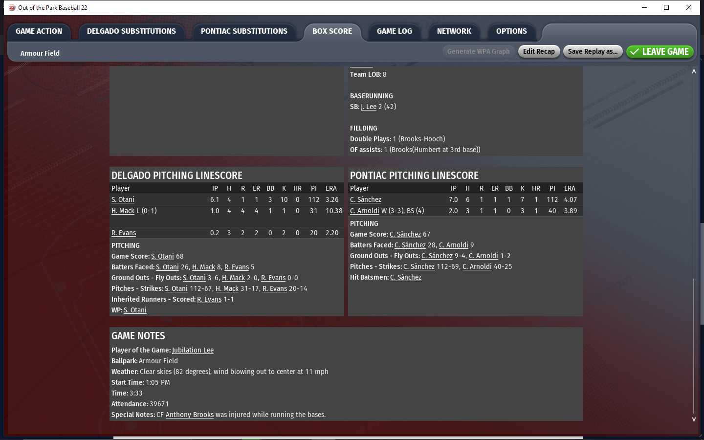 San Diego 3b Carlos Gonzalez will miss 2-3 weeks. LA Dodgers lose CF Lorenz Guicciardini for the season. Metropolis Cf Clark Kent is already the Single Season Homerun leader with 75 in 2034. He has 70 this season and is on pace to hit 95 HR. Delgado 1b Mighty Joe Young has 61 HR and is on pace for 83 HR.