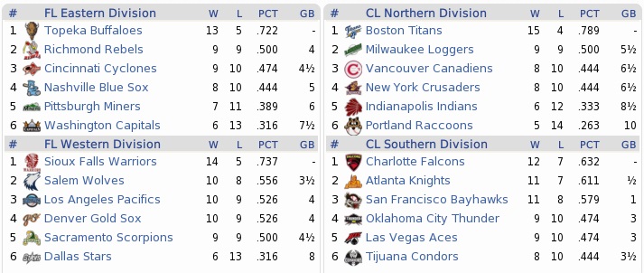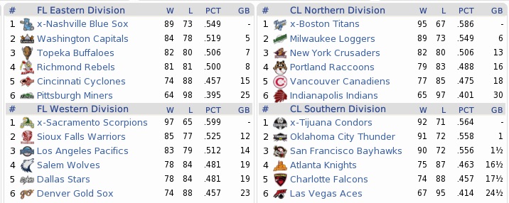 The 97-65 Scorpions enter the postseason as favorites despite missing SP Steve Rogers and INF Felipe Rivera with injuries. The team had the outright best pitching staff in the Federal League, ranking top 2 in all categories but walks and BABIP. Even without Rogers (16-5, 2.32 ERA), they have a formidable rotation and an almost fireproof bullpen. The offense is playing small ball with only 92 home runs, but high OBP and the second-most runs scored in the FL. In many ways, the 89-73 Blue Sox were trying to be the same team, but couldn’t. Although they had strong starting pitching around Dennis Fried (19-9, 2.44 ERA) and Javier Cruz (24-5, 2.60 ERA), their bullpen is rather bleak before the eighth and ninth inning. Also, the offense has not been their strong suit. They were dead-last in the league in home runs (61), and can’t match the Scorpions in terms of OBP and getting runs home either. They only had the fifth-most runs in the Federal League. While they don’t have significant injuries, they look like a much weaker team. The Titans, who finished 95-67, also played mostly small ball with only 83 home runs during the year, and also rode their pitching quite heavily, although they also have nice offensive qualities. They led the Continental League in runs scored, but scored almost 100 runs less than the Scorpions, who were second in the FL. This has happened with the same weapons the Scorpions employed: get on base, steal bases, don’t strike out. One problem for the Titans might be the injuries to C Luis Lopez and OF Tom Walls. Apart from C Julio Silva, they can not put up any starter with an average over .280, although walks will mitigate that at least partly for them. How the 92-71 Condors made the playoffs, apart from beating the Thunder in a tie-breaker, is a mystery. They were 6th in runs scored, 6th in runs allowed, and didn’t particularly excel in any one field. Pointing out strengths is as difficult as pointing out weaknesses, but they struggled to a 10-16 record in September, so they can not considered to be any hot, either. They could just as likely be the dark horse stomping over the opposition as they could be eliminated swiftly in the CLCS. --- Blue Sox @ Scorpions … 0-1 … (Scorpions lead 1-0) … SAC David Castillo 8.0 IP, 2 H, 0 R, 3 BB, 7 K, W; Condors @ Titans … 2-4 … (Titans lead 1-0) … BOS Jason O’Halloran 8.0 IP, 8 H, 2 R, 1 ER, 2 BB, 6 K, W; BOS Esteban Baldivía hits game-winning 3-run homer; Blue Sox @ Scorpions … 5-4 … (series tied 1-1) … NAS Logan Lee 3-5, 2B, 3 RBI; Condors @ Titans … 3-5 … (Titans lead 2-0) … BOS Dave Reid 2-4, HR, 2B, 3 RBI; Scorpions @ Blue Sox … 4-3 … (Scorpions lead 2-1) … Sacramento scores four in the first inning and rides that to the end Titans @ Condors … 5-4 … (Titans lead 3-0) Scorpions @ Blue Sox … 0-6 … (series tied 2-2) … NAS Dennis Fried 8.0 IP, 5 H, 0 R, 0 BB, 5 K, W; Titans @ Condors … 4-0 … (Titans win 4-0) … BOS Glenn Ryan 8.0 IP, 1 H, 0 R, 5 BB, 6 K, W; Scorpions @ Blue Sox … 2-5 … (Blue Sox lead 3-2) … NAS Javier Cruz 8.0 IP, 6 H, 2 R, 2 ER, 1 BB, 3 K, W; NAS Karl Davidson 4-4, HR, 2 RBI; Blue Sox @ Scorpions … 7-0 … (Blue Sox win 4-2) … NAS Roy Collier 7.0 IP, 4 H, 0 R, 1 BB, 4 K, W; NAS Karl Davidson 3-4, 3 2B, RBI; --- 1998 WORLD SERIES With the #1 seed Scorpions gone, the Titans will have home field advantage in the World Series. They do have to expect a different opponent than the swiftly swept Condors now, though. Both teams excelled pitching wise in the Championship Series round, with none of the ten games seeing more than nine runs scored. The Blue Sox, despite their worse record and homefield disadvantage, might have a slightly better team assembled, and they still don’t have any significant injuries. Blue Sox @ Titans … 3-1 … (Blue Sox lead 1-0) … NAS Dennis Fried 8.0 IP, 6 H, 1 ER, 2 BB, 8 K, W; NAS Jessie McGuire hits game-winning 3-run homer in the eighth Blue Sox @ Titans … 0-1 … (series tied 1-1) … BOS Jason O’Halloran 7.0 IP, 7 H, 0 R, 2 BB, 7 K; Titans @ Blue Sox … 7-6 (10) … (Titans lead 2-1) … NAS Lorenzo Flores scores Julio Silva with a wild pitch in the 10th to lose the game Titans @ Blue Sox … 4-1 … (Titans lead 3-1) … BOS Jesus Bautista 8.0 IP, 4 H, 1 R, 0 ER, 0 BB, 2 K, W; all runs score in the sixth inning Titans @ Blue Sox … 6-5 … (Titans win 4-1) … BOS Luis Alonso 3-5, 2 RBI; BOS Esteban Baldivía 3-4, BB, 2B, RBI; NAS Freddie Jones 4-4, BB; After the Blue Sox lost the third game on a wild pitch, they also lost the series on a wild pitch. In the top 7th of game 5, with the score tied 5-5, Carlos Gonzales was pitching to Julio Silva with Luis Alonso on second base and one out. Gonzales’ 0-2 pitch was wild, advancing Alonso to third base, and from there he scored when Silva hit a sac fly on the next pitch. Manuel Chavez then struck out. In the bottom 9th, Jose Valentín put the winning runs for the Blue Sox in scoring position with one out. After that, Jessie McGuire and Mauro Valdés popped out to short and the catcher, respectively. Julio Silva made the grab that won the World Series, then held up the ball in his bare hand, while pointing, mouth wide open, at his own bench, which rapidly emptied. Silva then ran out to Bennett to show the ball to him as well, before the dark blue team converged in a pile of huddles. Although the Continental League managed to win only eight of the 22 championships so far, the CL North has only one team without a title, the Loggers. The Crusaders (1979), Indians (1981), Canadiens (1982, 1984), and Raccoons (1992-93) all have won titles before. The Thunder are the only CL South team to win. The FL West has seen five of its teams triumphant too (everybody except the Pacifics), while in the FL East the Buffaloes and Miners have never won the championship. 1998 WORLD SERIES CHAMPIONS