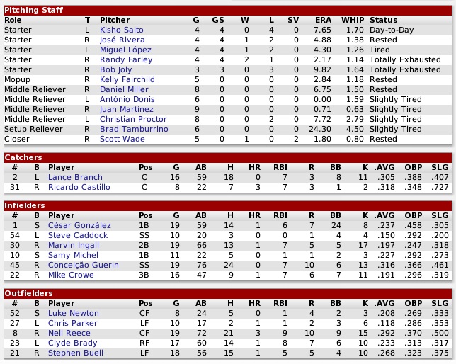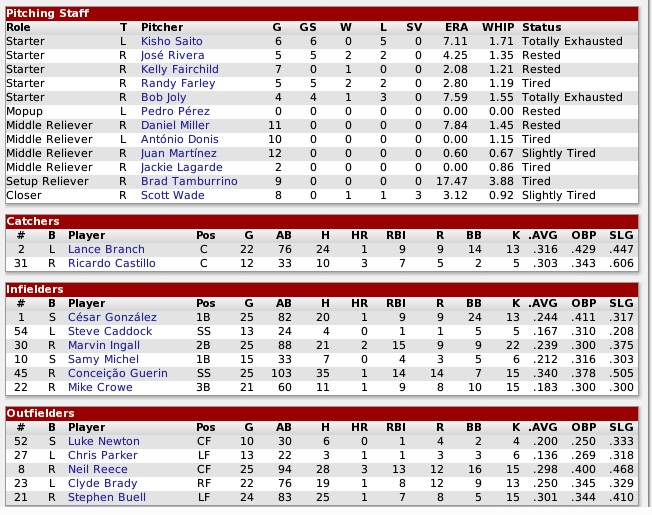 The Thunder were about average in many categories, with their offense lagging a bit behind and their pitching being a bit better than average. Both teams entered with 67 runs scored, but the Thunder had allowed only 71 runs to the Raccoons’ 95. Off days will be sparse for the next six weeks, as we are starting a string of 13 games, which will be followed by strings of 13 and 20 straight games. Tough times ahead for this franchise in any respect. Projected matchups: Kisho Saito (0-4, 7.65 ERA) vs. Aaron Anderson (1-3, 2.05 ERA) Jose Rivera (1-2, 4.88 ERA) vs. Lou Corbett (1-3, 5.87 ERA) Miguel Lopez (1-2, 4.30 ERA) vs. Fabien Armand (4-0, 2.42 ERA) Game 1 POR: SS Guerin – RF Buell – CF Reece – 3B Gonzalez – C Branch – 2B Ingall – LF Parker – 1B Michel – P Saito OCT: LF Bonneau – 1B J. Valentín – RF Barnes – SS Grant – 3B Higashi – C Briggs – 2B Bradley – CF Camacho – P Anderson Fifth start of the year for Saito, fifth time he got annihilated. After three scoreless innings, during which the Thunder left on six runners, and the Coons twice left a runner on third base, Iván Camacho put the Thunder on winners’ road with a solo home run in the fourth. Saito would give up three home runs for five total runs (four earned) and not get out of the sixth inning. The Raccoons managed an RBI groundout by Reece in the sixth (getting a double digit RBI player in the process – whoah, boys, slow down, I’m getting diz-zay!), and that was it. Apart from leaving the bags full in the sixth and eighth they didn’t manage to cock up anything else. 5-1 Thunder. Guerin 2-4; Buell 2-3, BB; Gonzalez 3-4; Game 2 POR: SS Guerin – LF Buell – CF Reece – 1B Gonzalez – C Branch – 2B Ingall – RF Newton – 3B Crowe – P Rivera OCT: LF Bonneau – 2B Browne – SS Grant – RF Barnes – C Briggs – 1B J. Valentín – 3B Bradley – CF Camacho – P Corbett Bottom 2nd, leadoff single by Artie Barnes, first runner for the Thunder. Barnes advanced on a wild pitch, stole third base, and with two down scored on an infield single that Rivera failed to make a play on himself. 1-0 Thunder, in other words: ballgame. Well, not that quick, young grasshopper. Neil Reece tied the score with a 2-out RBI single in the top 3rd. Once Gonzalez pitifully struck out to ensure not to take a lead, Concie Guerin, one of the few guys battling on this team, made a marvelous play in the bottom 4th. After Rivera had walked Barnes and Briggs to lead off the frame, Guerin intercepted a liner off Valentín’s bat that appeared to be surely heading for an RBI single, and forced out Barnes who had already been almost at third base, and the Thunder didn’t score in the inning. Lance Branch’s first home run as a Coon even put the team up 2-1 in the sixth! Rivera didn’t get out of the sixth inning, though. A Bob Grant triple with one out built up pressure, Rivera walked Barnes, and Briggs just barely chopped out to Newton, and Grant didn’t tag and go. With the left-handed Valentín up, we played a “You win” card to the Thunder and replaced Rivera with Donis, who surprisingly did not give up a first pitch home run, but had Valentín ground out to Gonzalez to end the inning still up 2-1. Bottom 7th, Camacho singled off Martinez with one out. When he set off to steal second base, Branch’s throw was into the outfield and Camacho went to third. Martinez managed to strike out Lou Corbett, and with Proctor not being reliable, remained in to face left-handed Yohan Bonneau, and got him to pop out to Guerin. With the bags full and no outs in the top 8th, the Coons overwhelmed Corbett – not. Gonzalez hit a sac fly, Branch into a double play, and I was dying to see how they would finally lose this one. Bringing in Tamburrino was a good move in the right direction, as he loaded the bags in the bottom 8th, but then I made the mistake of replacing him with Scott Wade, who got the third out with a fly to Newton off John Bradley’s bat. Top 9th, bases loaded with one out, Guerin hit into a double play, and Wade was to face four left-handers to start the bottom 9th, so we were still good to lose this one by a fair margin. But Wade set Camacho, Juan Jose Villa, and Bonneau down in order for a stunning, rousing, apocalyptic …: 3-1 Raccoons. Guerin 2-5; Buell 2-4; Branch 2-4, HR, RBI; Castillo 1-1; Wade 1.1 IP, 0 H, 0 R, 0 BB, 0 K, SV (3), IR 3-0; Still can’t believe we didn’t lose this. Game 3 POR: SS Guerin – 2B Ingall – CF Reece – 1B Gonzalez – LF Buell – C Castillo – RF Brady – 3B Crowe – P M. Lopez OCT: 1B J. Valentín – 2B Browne – RF Barnes – SS Grant – 3B Higashi – C Briggs – LF J.J. Villa – CF Camacho – P Armand Miguel Lopez faced only three batters, putting two on, before signaling for the trainer that something was amiss. He left the game, Fairchild came in and conceded one run, but would then draw a leadoff walk in the top 3rd, advanced on a balk, and eventually scored on an Ingall single. And the Thunder continued to make mistakes. When the Raccoons had a pair in scoring position with one out in the fourth, Mike Crowe’s grounder to short was thrown widely to first, pulling Valentín off the bag and Crowe was safe. Fairchild then singled threw Bob Grant, and a walk to Guerin loaded the bags already up 3-1. Another Ingall single was what the doctor ordered, but we took the full count walk that Armand offered just a swell. Reece also battled to draw a walk, and while Gonzalez and Buell made outs, Fairchild was now up 5-1. The Thunder made another error in the fifth, aiding the Coons to score two more runs, and all was well – until Proctor got involved with the game in the sixth. He sucked abysmally, facing six batters and put five on. It just wasn’t going to stop, and with the tying run at the plate, Miller was thrown into the fray, and retired the next two, Grant and Higashi. But we were not done with crazy just yet. Flip to the top 7th, the Raccoon