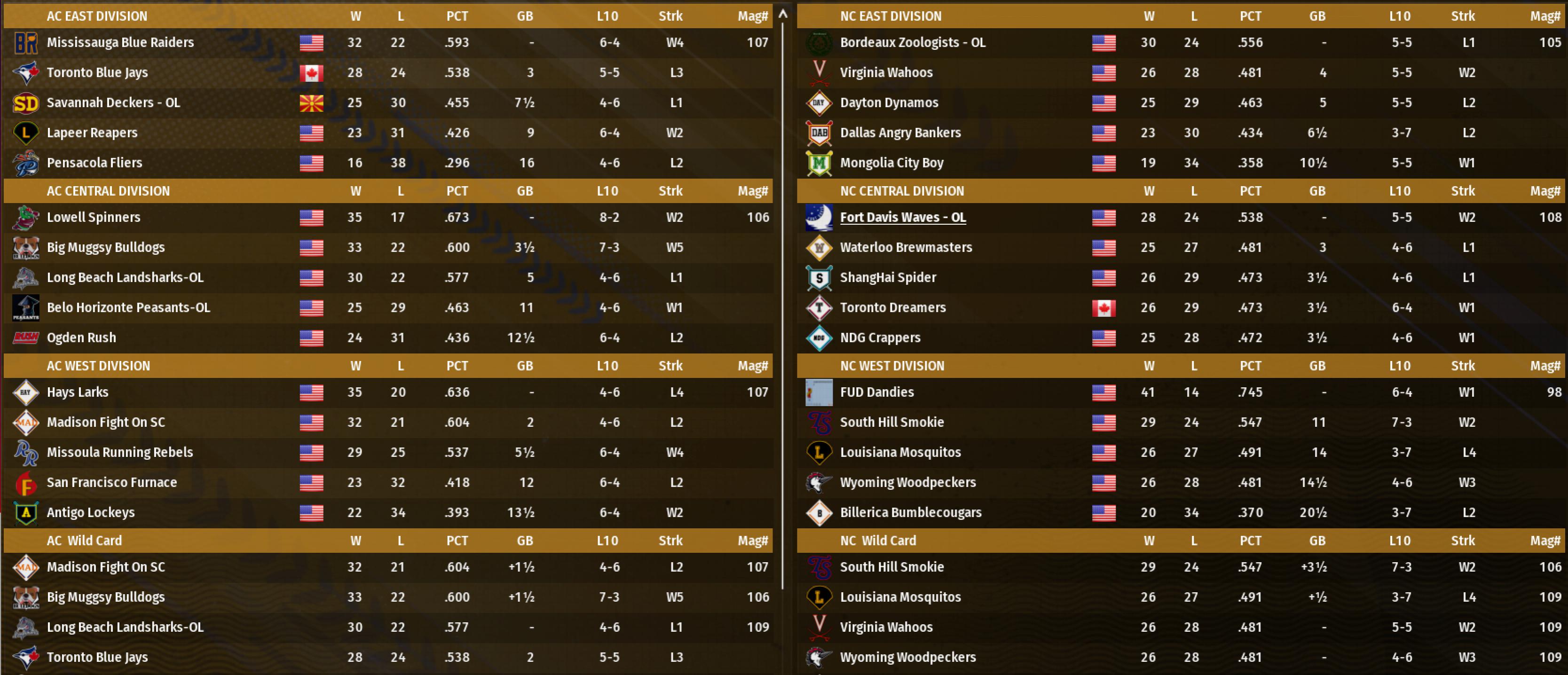 Taking a quick look at S.275 today and it appears the Indiana Barons WERE in OL yesterday, but today has dropped the "OL" tag and has at least two live players on their roster. I don't have time to follow up with the team owner or how to correct the issue, but it appears that Holy City still leads the league with Shinbone a close second (if one or more games against Indiana aren't disqualified).