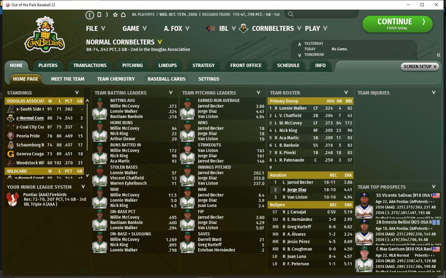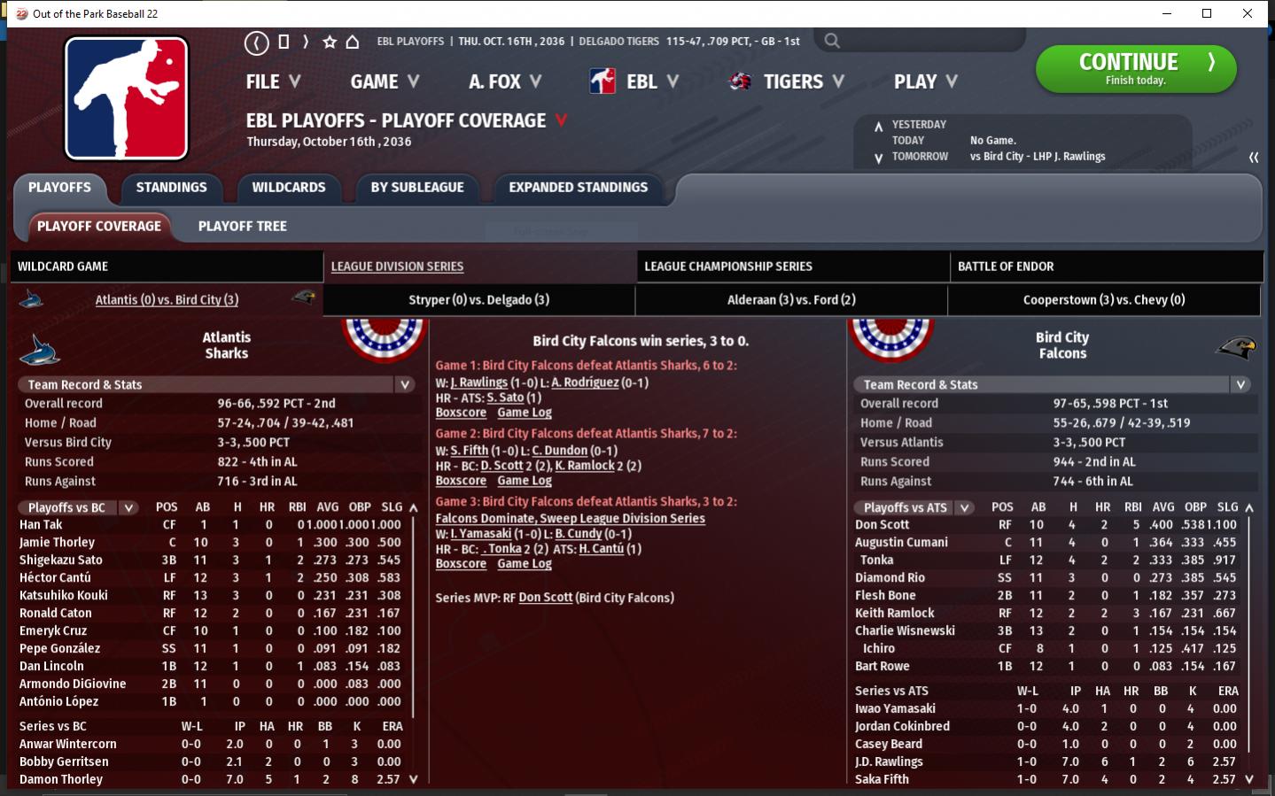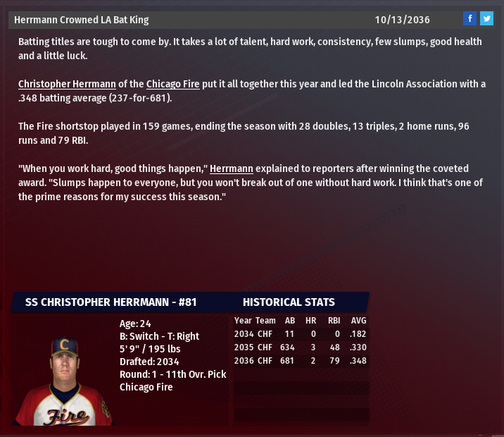 SS Christoper Herrmann, CHF wins the LA batting title. LF Willie McCovey, NOR wins the DA batting Triple Crown, his 4th consecutive. Chicago Fire finish 1st atop the LA. They were the LA Wildcard last season losing in the Wildcard Round. Aurora Aces are the #1 LA WC. They last made the playoffs in 2024. Lombard Falcons are the #2 LA WC. They missed the playoffs last season after 8 consecutive appearances. South Side Hitmen win the DA. They last made the playoffs in 2032. Normal Cornbelters are the #1 DA WC. It is their 5th consecutive playoff appearance. They were a wildcard team last year, losing to the Boomers in the WC round. Coal City Coalers are the #2 DA WC. It is their 1st playoff appearance.