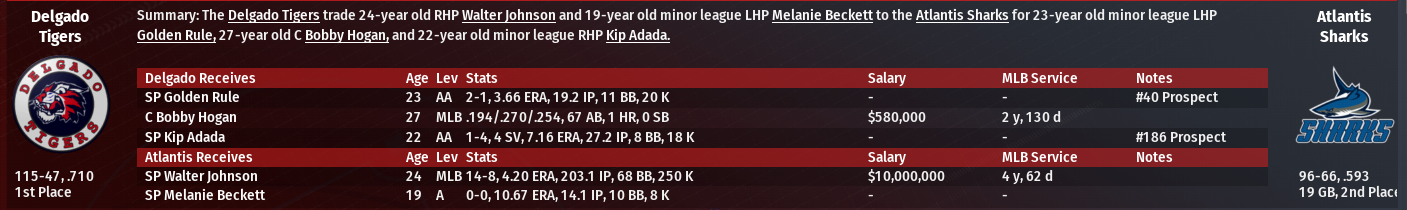 Delgado Tigers traded Sp Walter Johnson & minor league SP Melanie Beckett to the Atlantis Sharks for C Bobby Hogan & minor leaguers SP Golden Rule & SP Kip Adada.