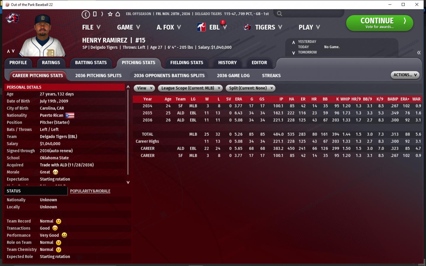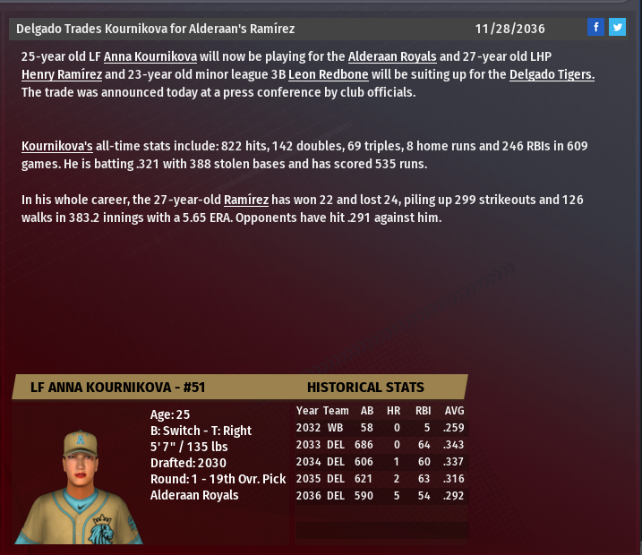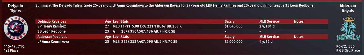 Delgado Tigers traded Lf Anna Kournikova to the Alderaan Royals for SP Henry Ramirez & minor league 3b Leon Redbone.