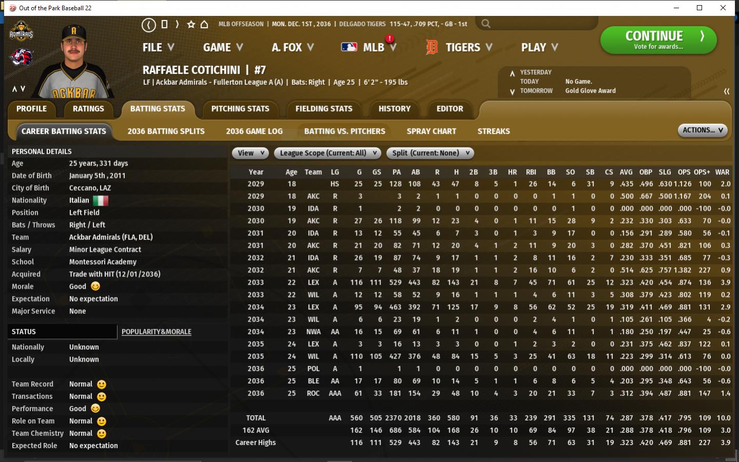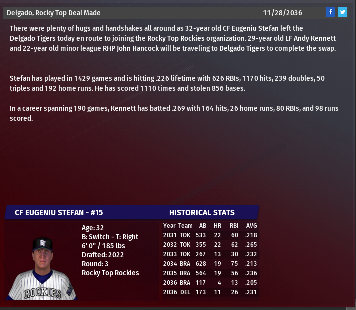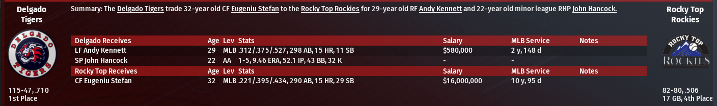 Delgado Tigers traded Cf Eugeniu Stefan to the Rocky Top Rockies for Lf Andy Kennet & minor league SP John Hancock.