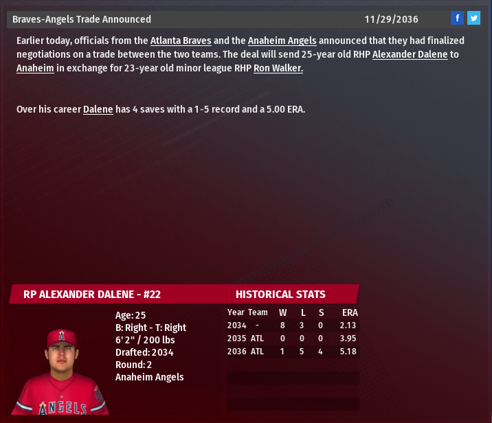 Atlanta Braves traded RP Alexander Dalene to the Anaheim Angels for a minor league SP.