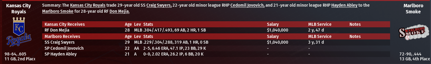 Panasonic Dragons re-sign C Brian Kelton to a 5 yr extension. Kansas City Royals traded SS Craig Swyers & 2 minor leaguers to the Marlboro Smoke for Rf Don Mejia.