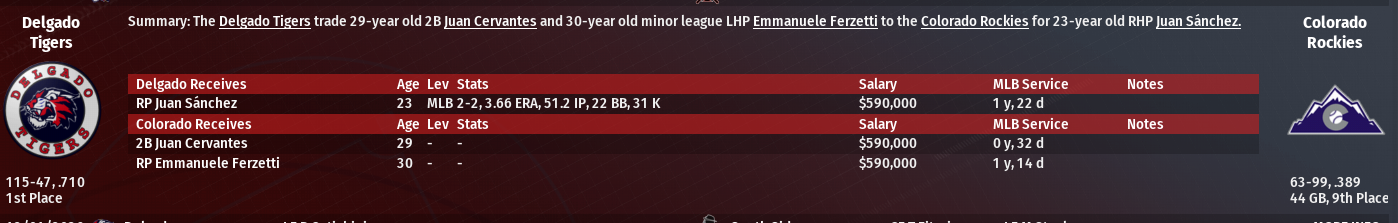 Delgado Tigers traded RP Emmaneule Ferzetti & minor league 2b Juan Cervantes to the Colorado Rockies for minor league RP Juan Sanchez.