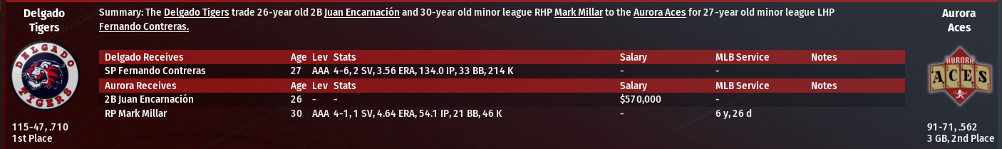 Delgado Tigers traded minor league 2b Juan Encarnacion & RP Mark Millar to the Aurora Aces for SP Fernado Contreas.