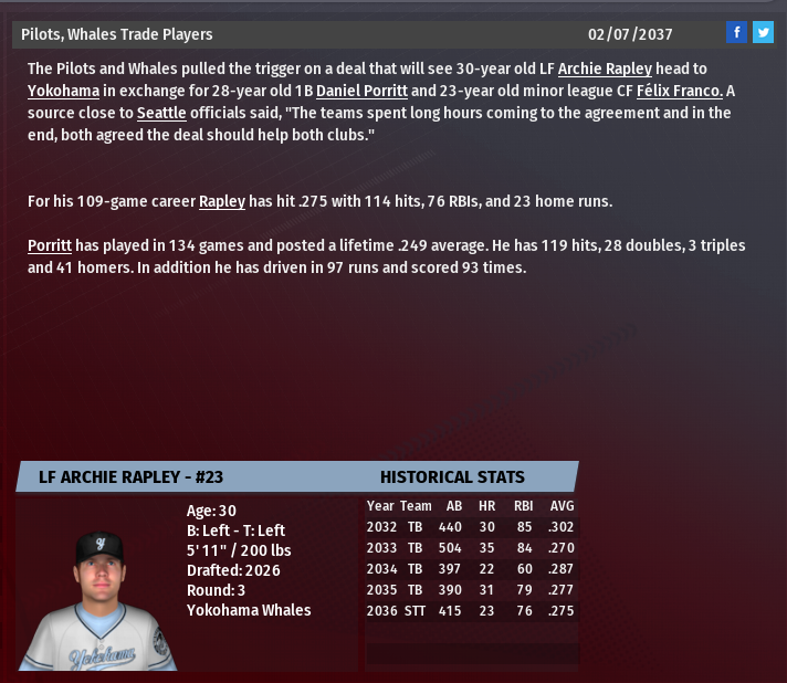 Seattle Pilots traded Lf Ethan Rapley to the Yokohama Whales for 1b Daniel Porritt & a minor league Cf.